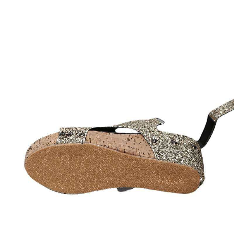 women shoes大码亮片鱼嘴坡跟凉鞋女松糕厚底魔术贴高跟女鞋2024
