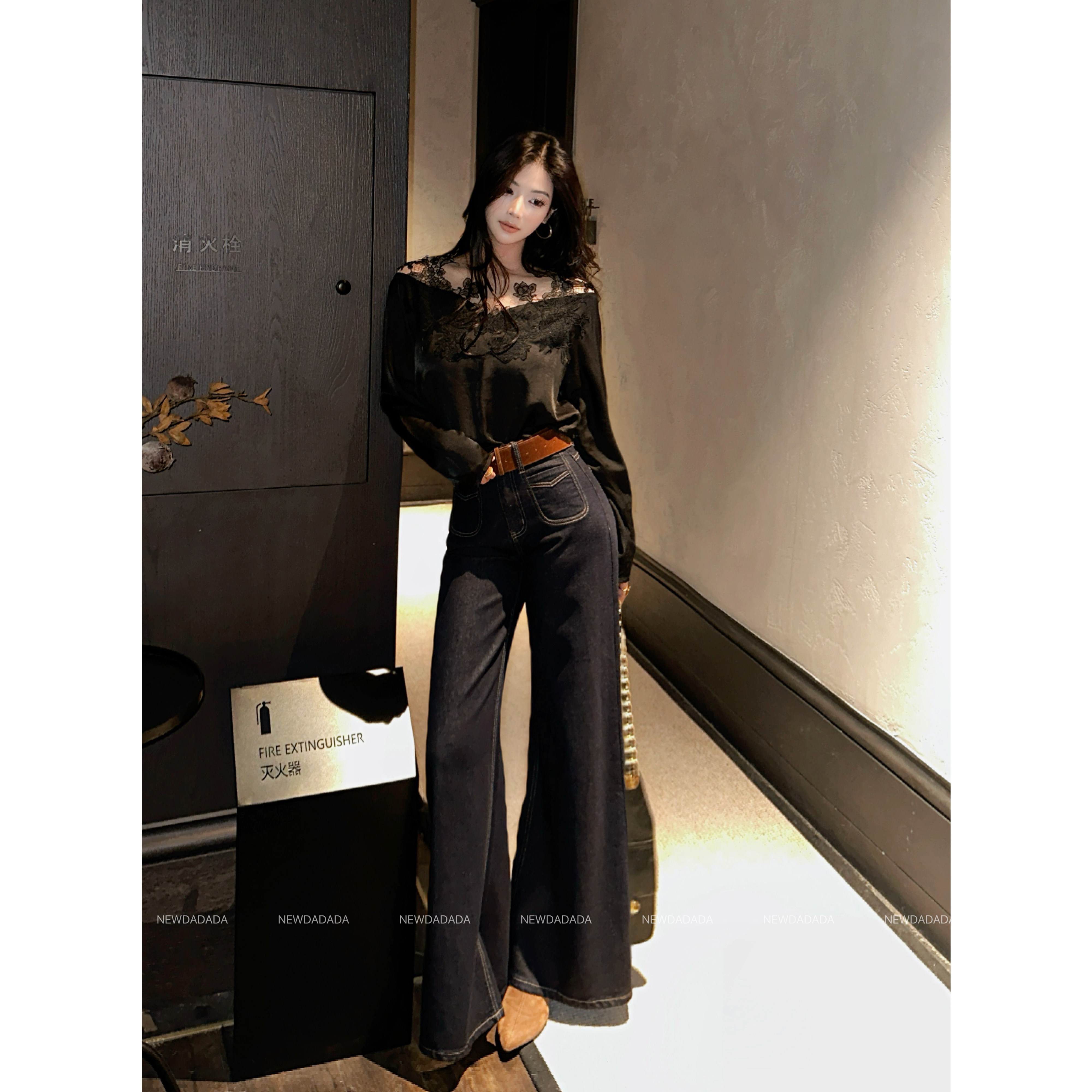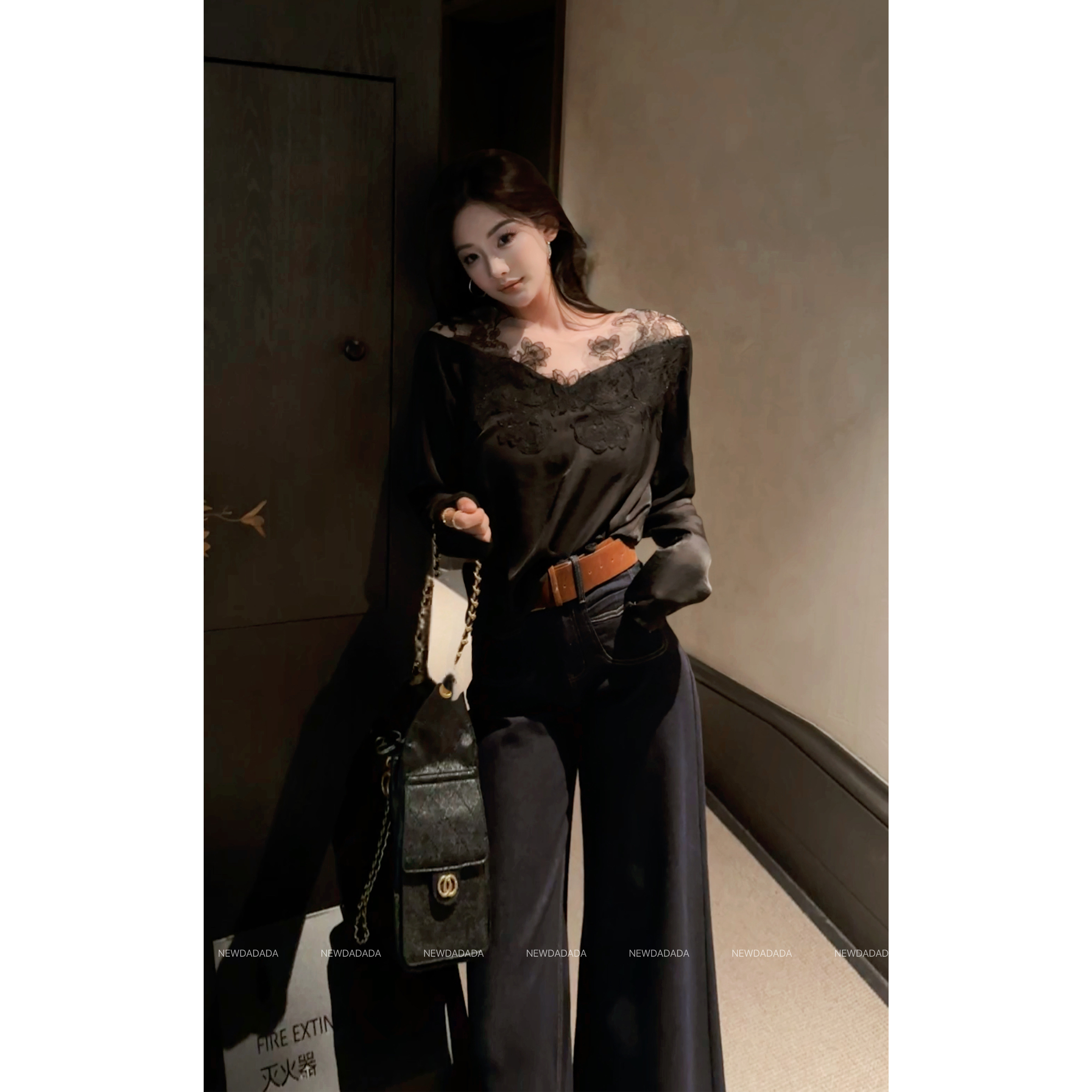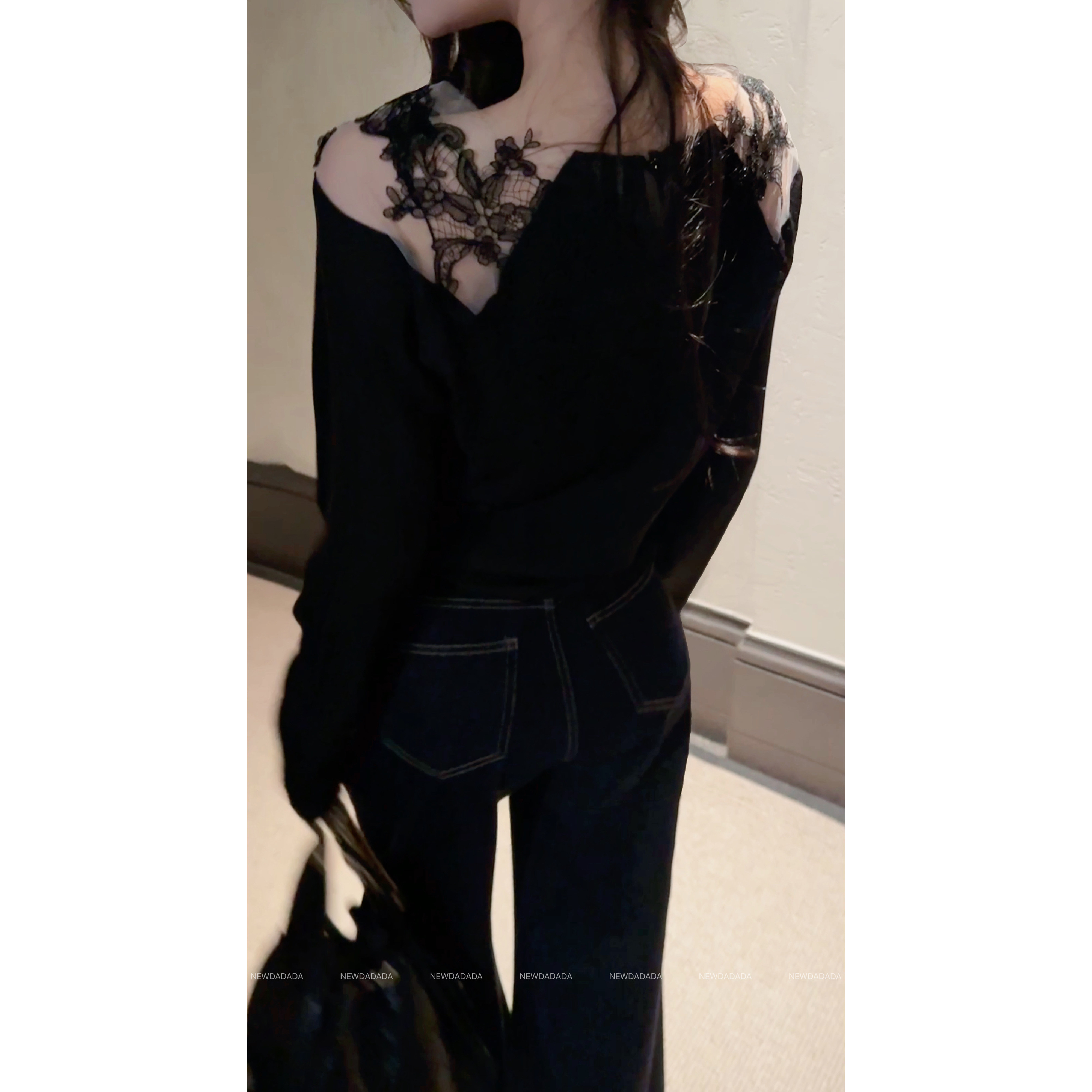 利达 NEW DADADA【柔调森语】黑色蕾丝拼接长袖上衣女修身显瘦T恤