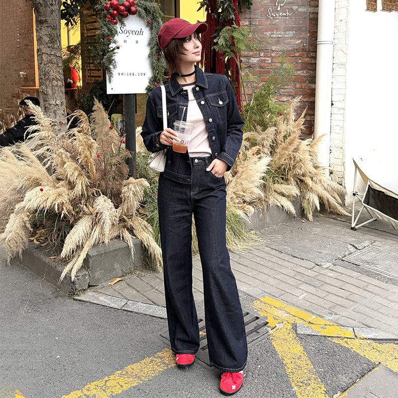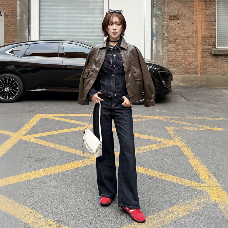 热风女士牛仔裤2026年春季新款宽松直筒牛仔裤深色显瘦阔腿长裤