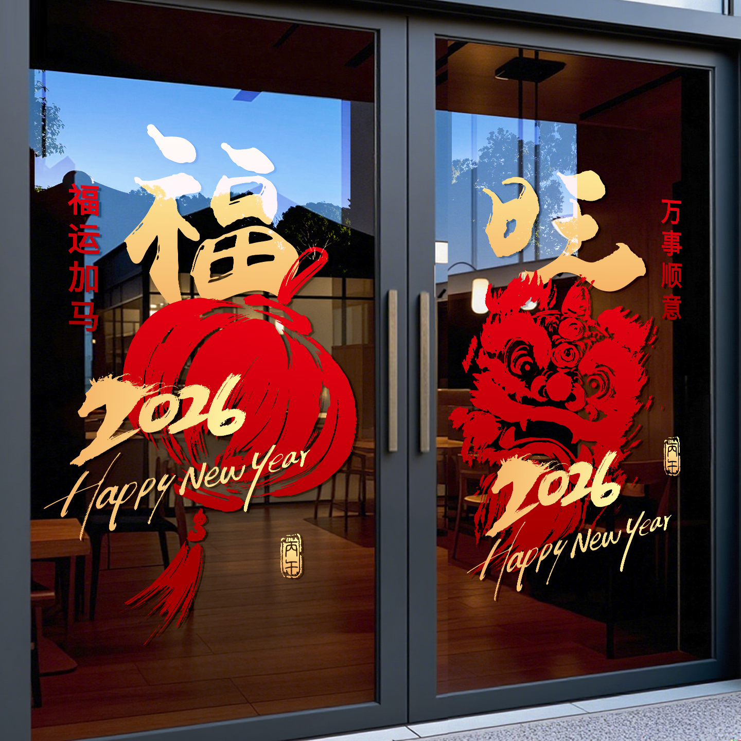 新年装饰福字玻璃门贴纸马年春节橱窗场景布置中式舞狮红灯笼窗贴
