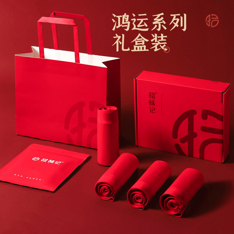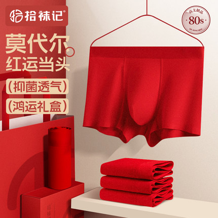 拾袜记本命年男士内裤大红色结婚礼盒秋冬无痕大码透气平角短裤