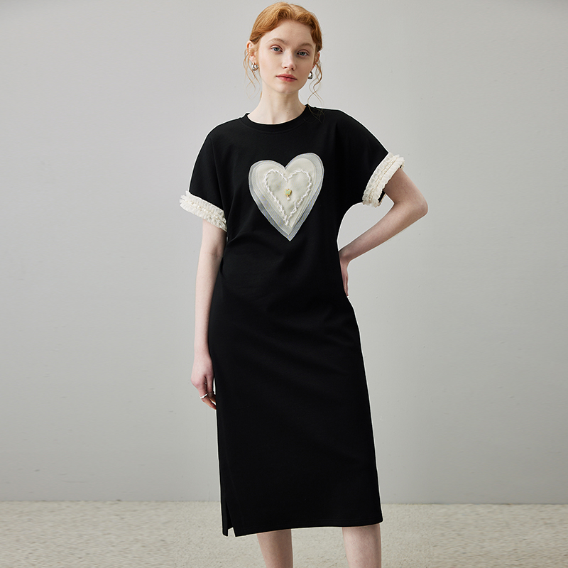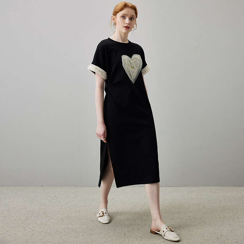 dfvc时尚黑色T恤连衣裙女2025新款秋季爱心宽松显瘦圆领中长裙子