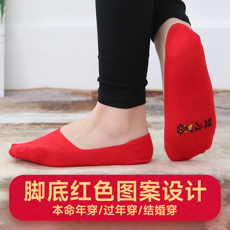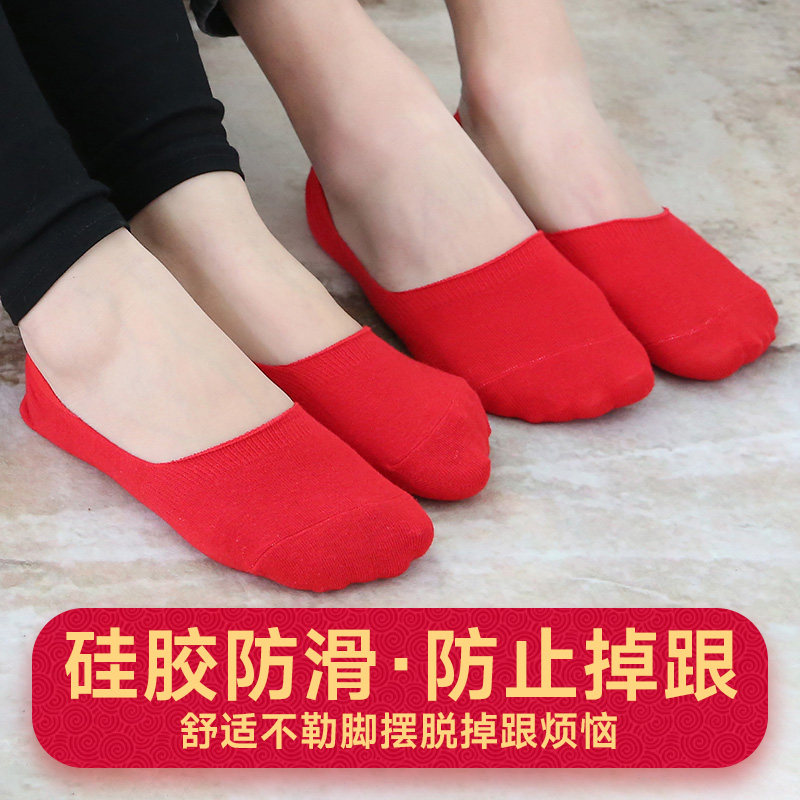 本命年大红色船袜男夏季纯棉防臭薄款透气隐形袜女士硅胶防滑属马