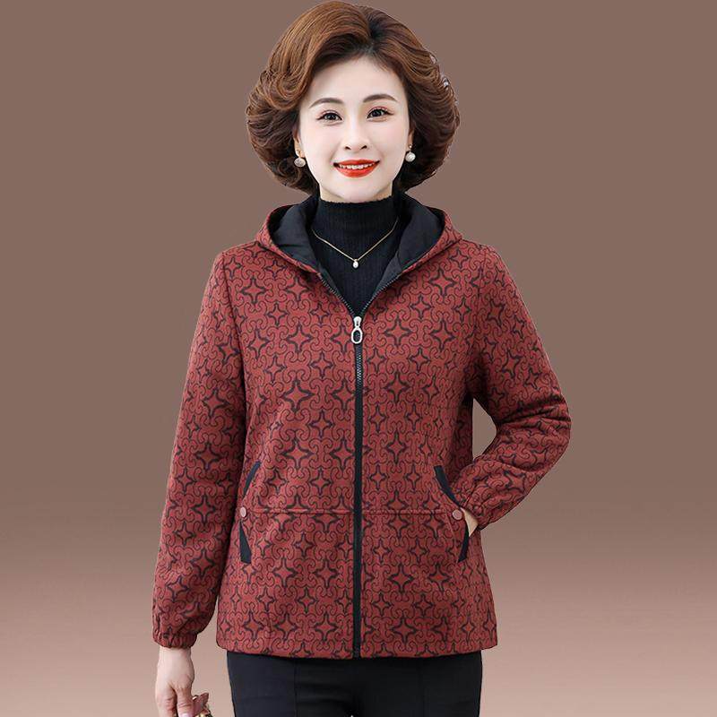 妈妈冬季大码加绒棉衣外套新款保暖连帽上衣中老年女冬装加厚棉服