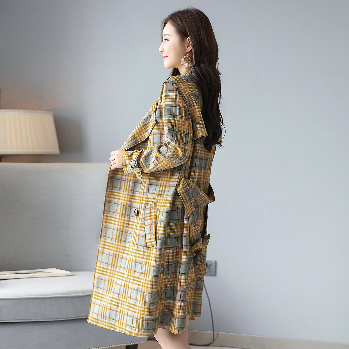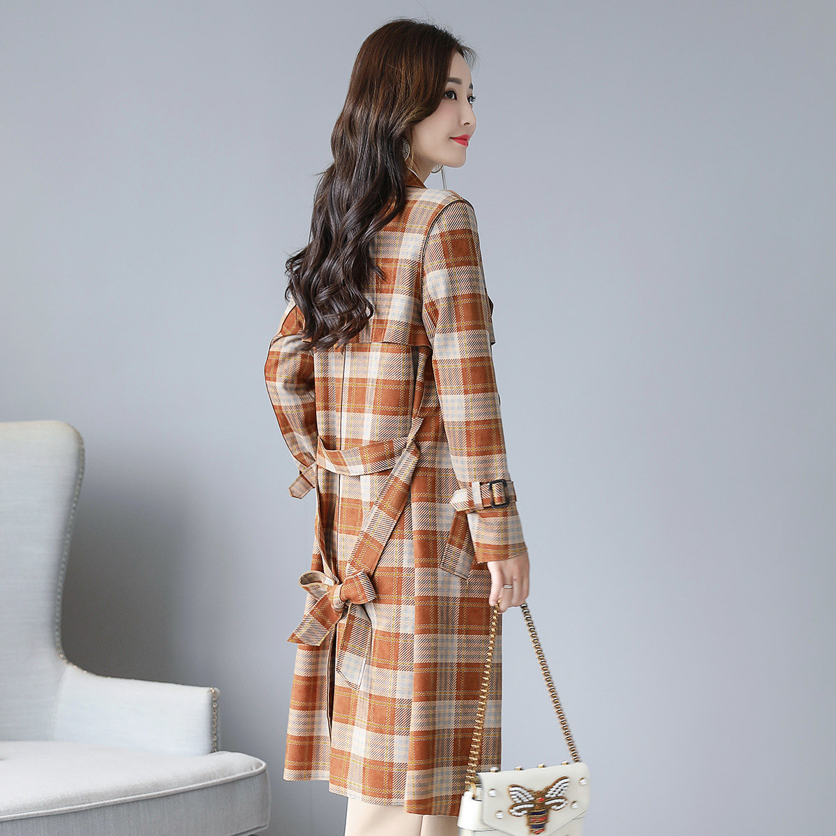 【品牌清仓 售完不补】春季风衣收腰鹿皮绒格子双排扣港风外套