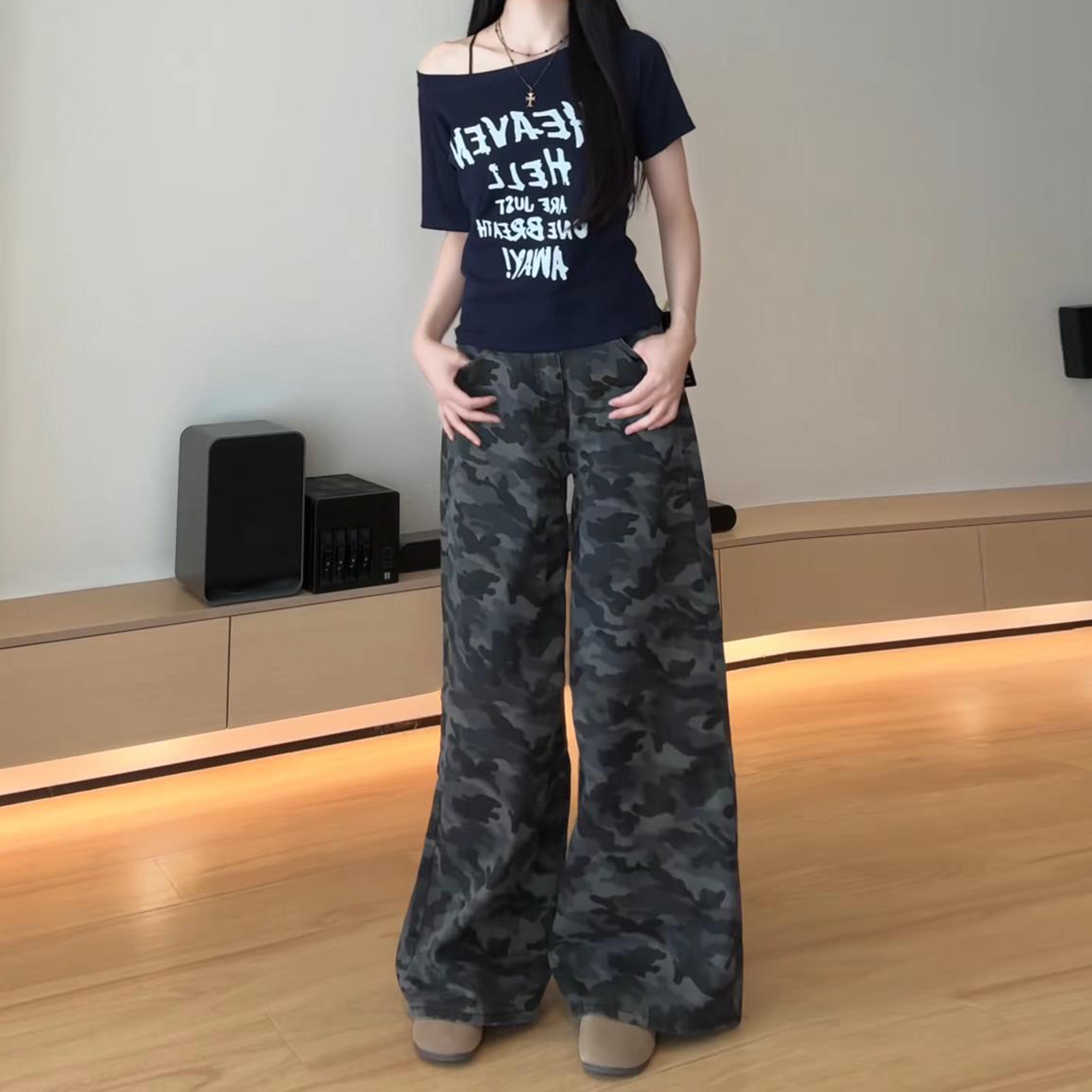 大码高腰复古迷彩牛仔裤女夏季胖mm小众显瘦遮胯百搭直筒阔腿长裤