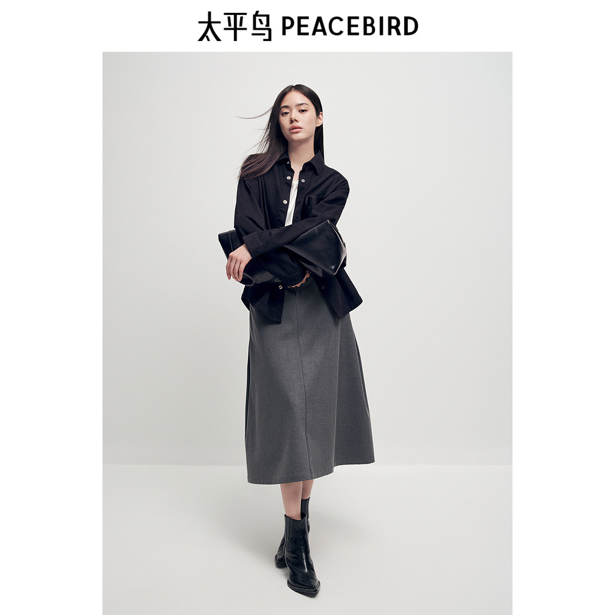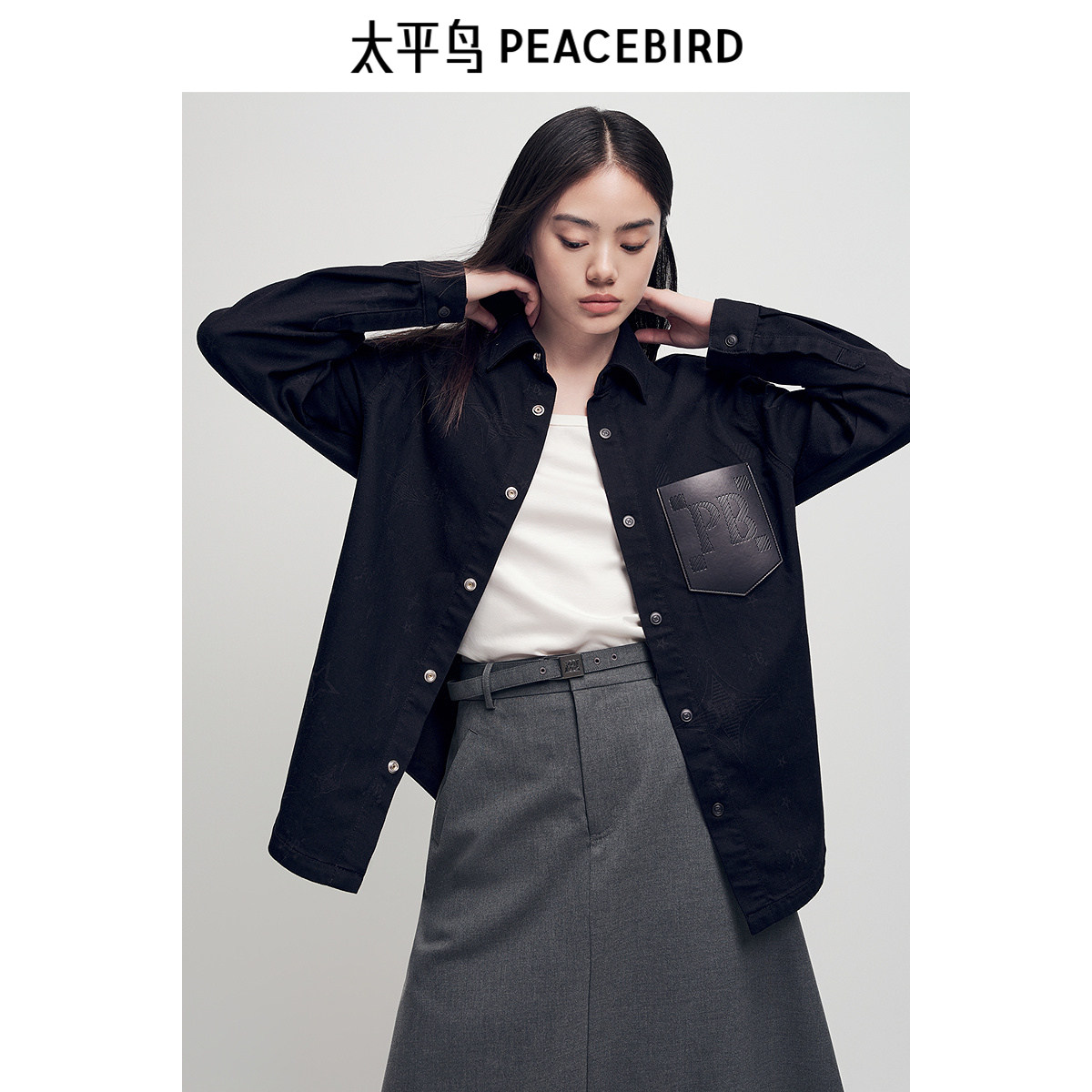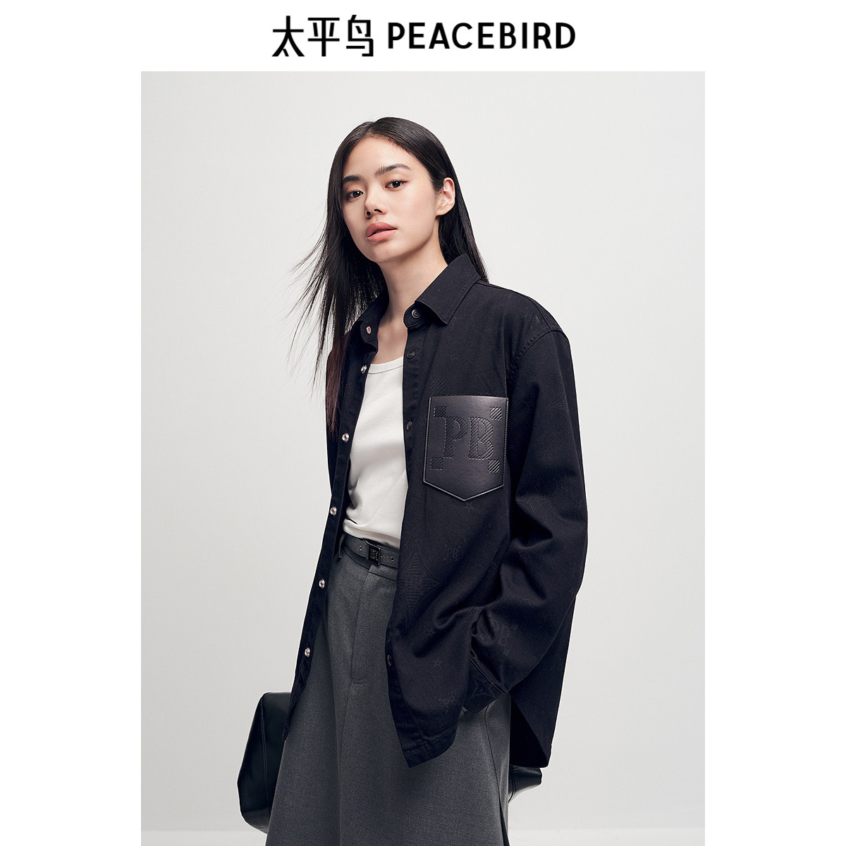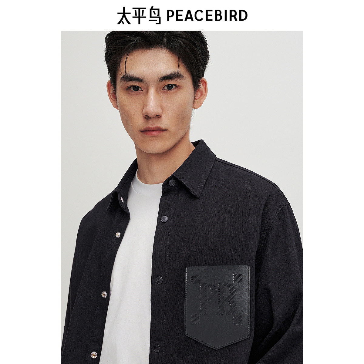 太平鸟男装 休闲衬衫秋季宽松皮口袋拼接牛仔衬衫上衣男