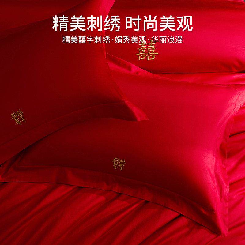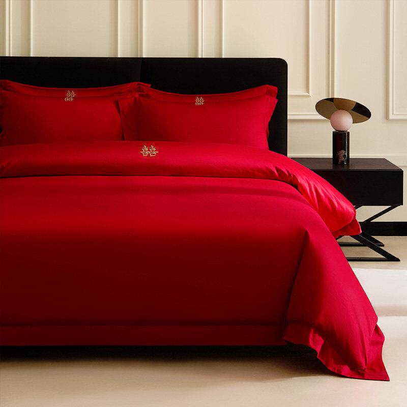 红豆A类全棉长绒棉刺绣婚庆四件组结婚中式红色被套床单新婚床品