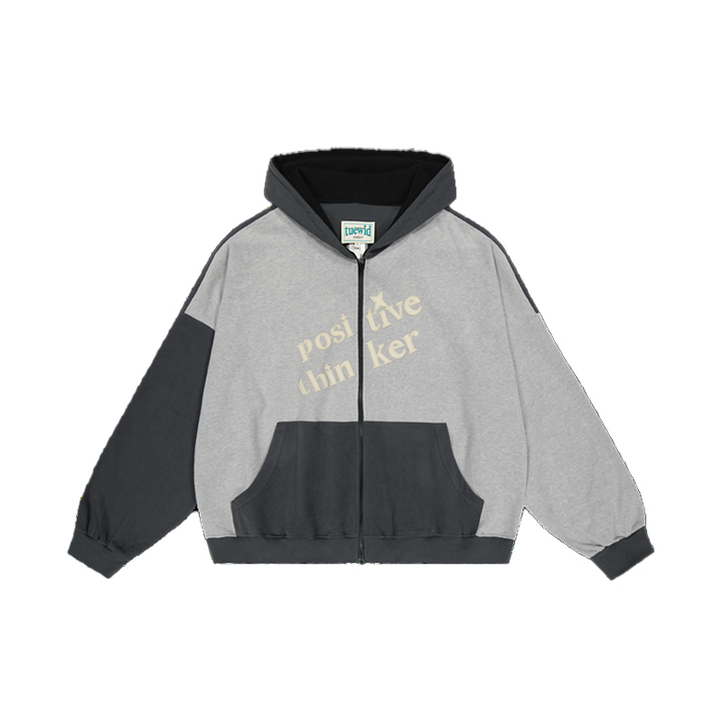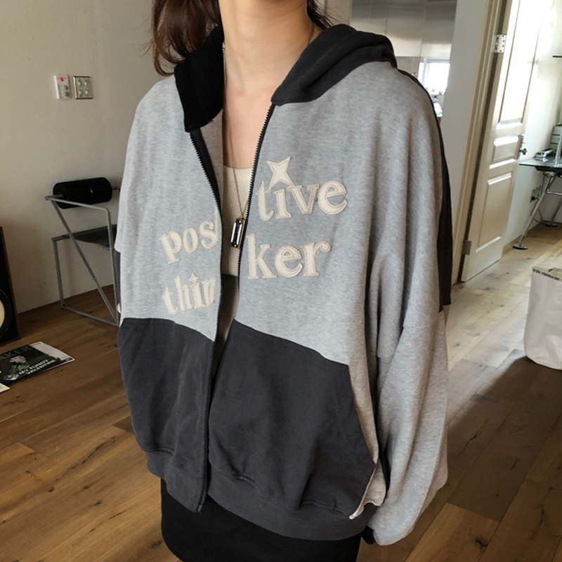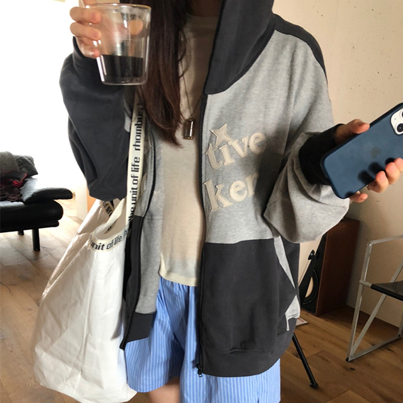 韩国Tuewid字母绣花拉链连帽卫衣秋季宽松拼色外套男女同款开衫潮