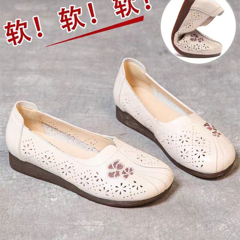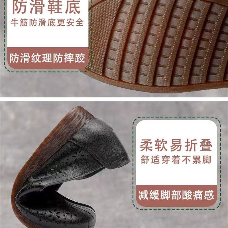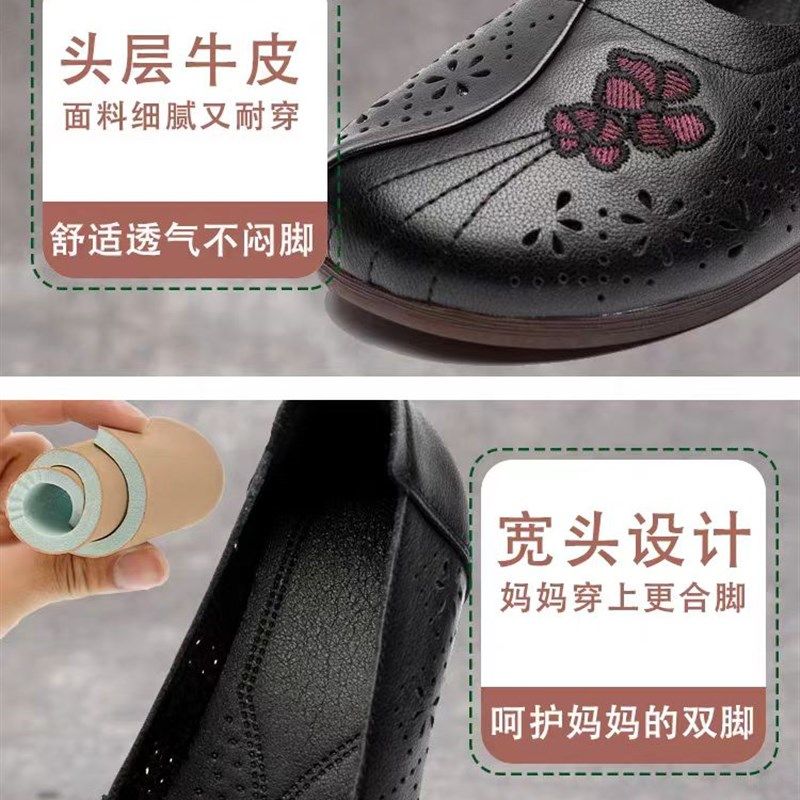 真皮牛筋底妈妈凉鞋女夏季平底防滑镂空老年人复古中老年洞洞单鞋