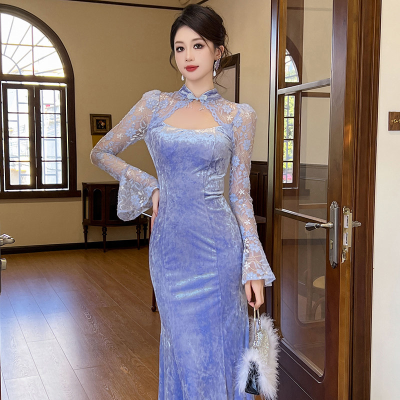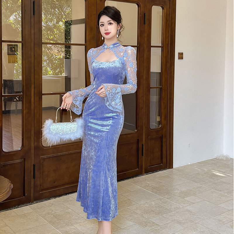 蕾丝长袖宫廷风包臀丝绒连衣裙性感优雅镂空新中式改良鱼尾旗袍裙