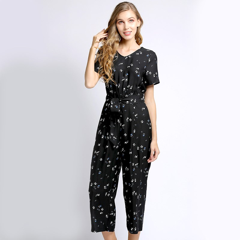 欧美春秋碎花短袖v领九分阔腿连体衣裤女夏长连身裤2024新款大码