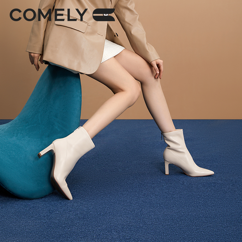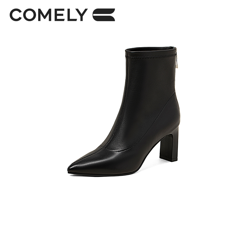 康莉时装靴女真皮冬季新款尖头粗跟瘦瘦靴时尚高跟短靴子