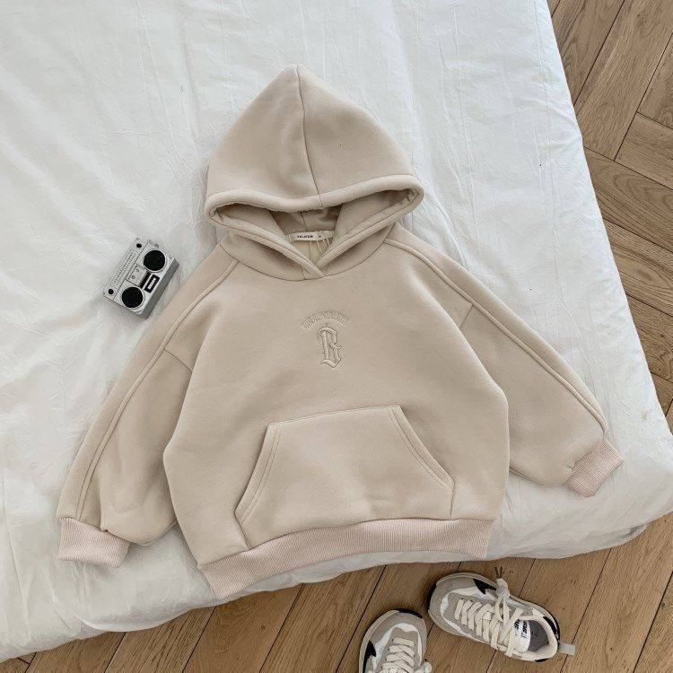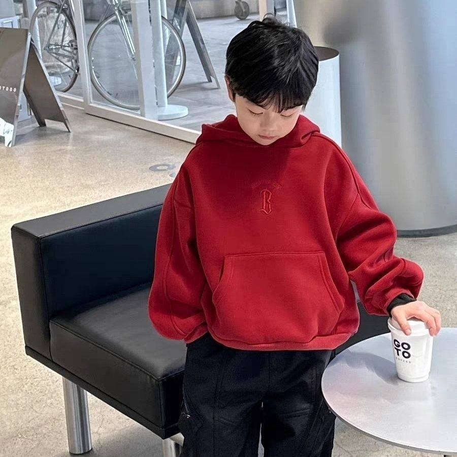 儿童字母刺绣连帽套头卫衣加绒加厚新年红色冬韩版男女童宽松上衣