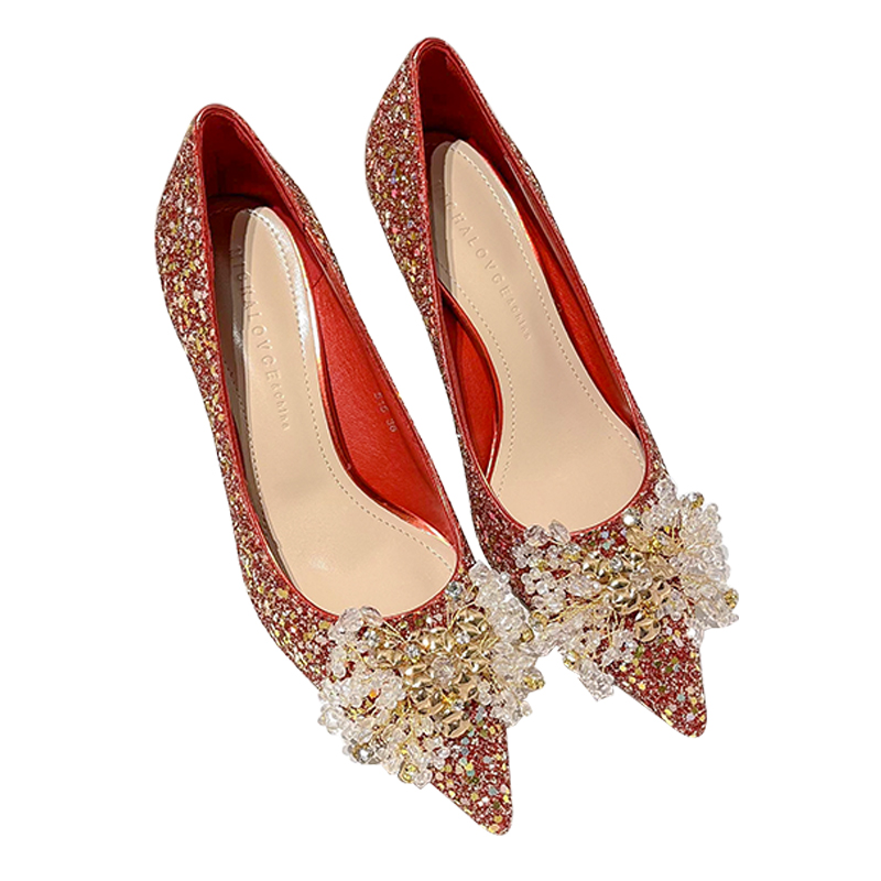 2022年秋新款红色婚鞋新娘秀禾婚纱两穿尖头低跟亮片高跟鞋女3CM