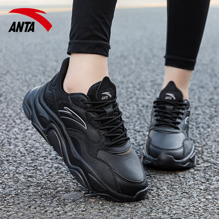 安踏女鞋小千禧2025新款秋冬皮面休闲鞋子老爹鞋黑色厚底运动鞋女
