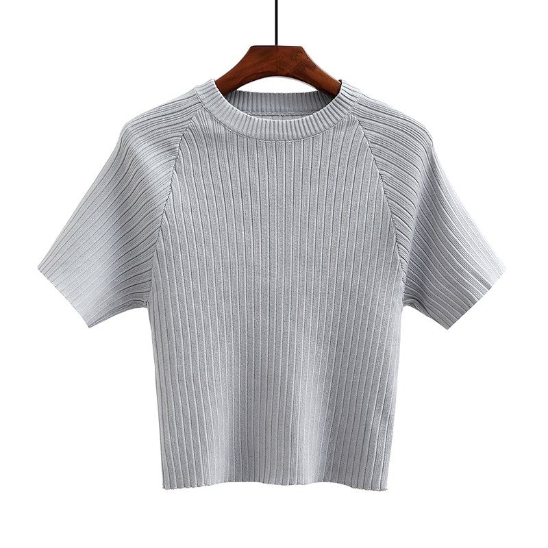 韩版圆领针织t恤女短袖宽松百搭纯色外穿冰丝上衣短款打底衫夏季