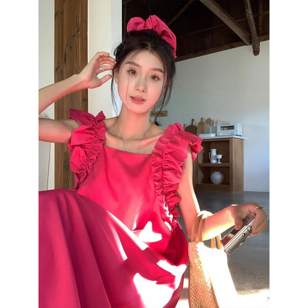 气质玫红色小飞袖方领连衣裙女夏季宽松显瘦长裙甜美海边夏季裙子