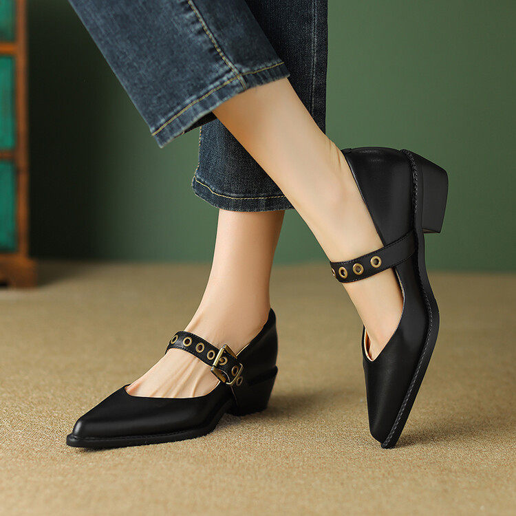 复古时尚皮带扣尖头粗跟中跟一字带玛丽珍鞋女棕色百搭浅口单鞋秋