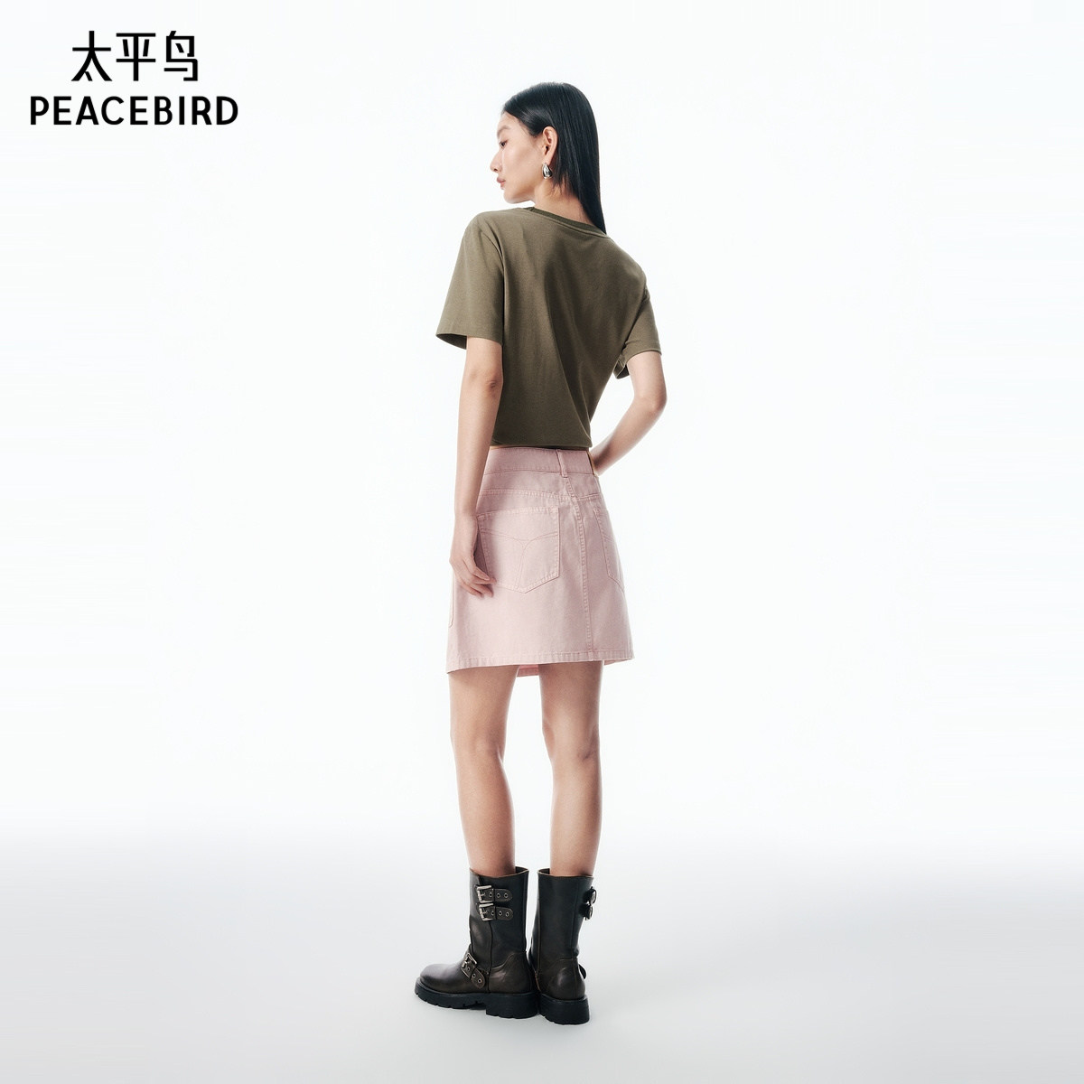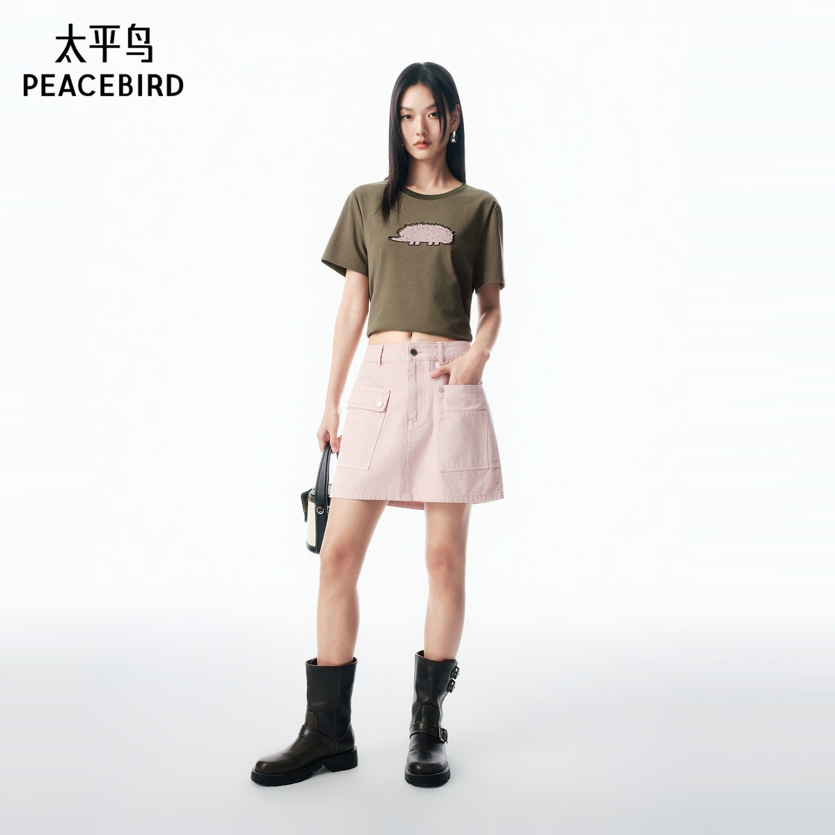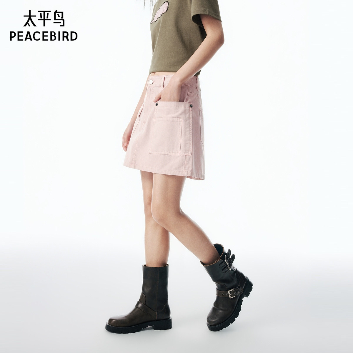 【商场同款】太平鸟浅粉色牛仔半身裙女2025夏新款A字工装风短裙