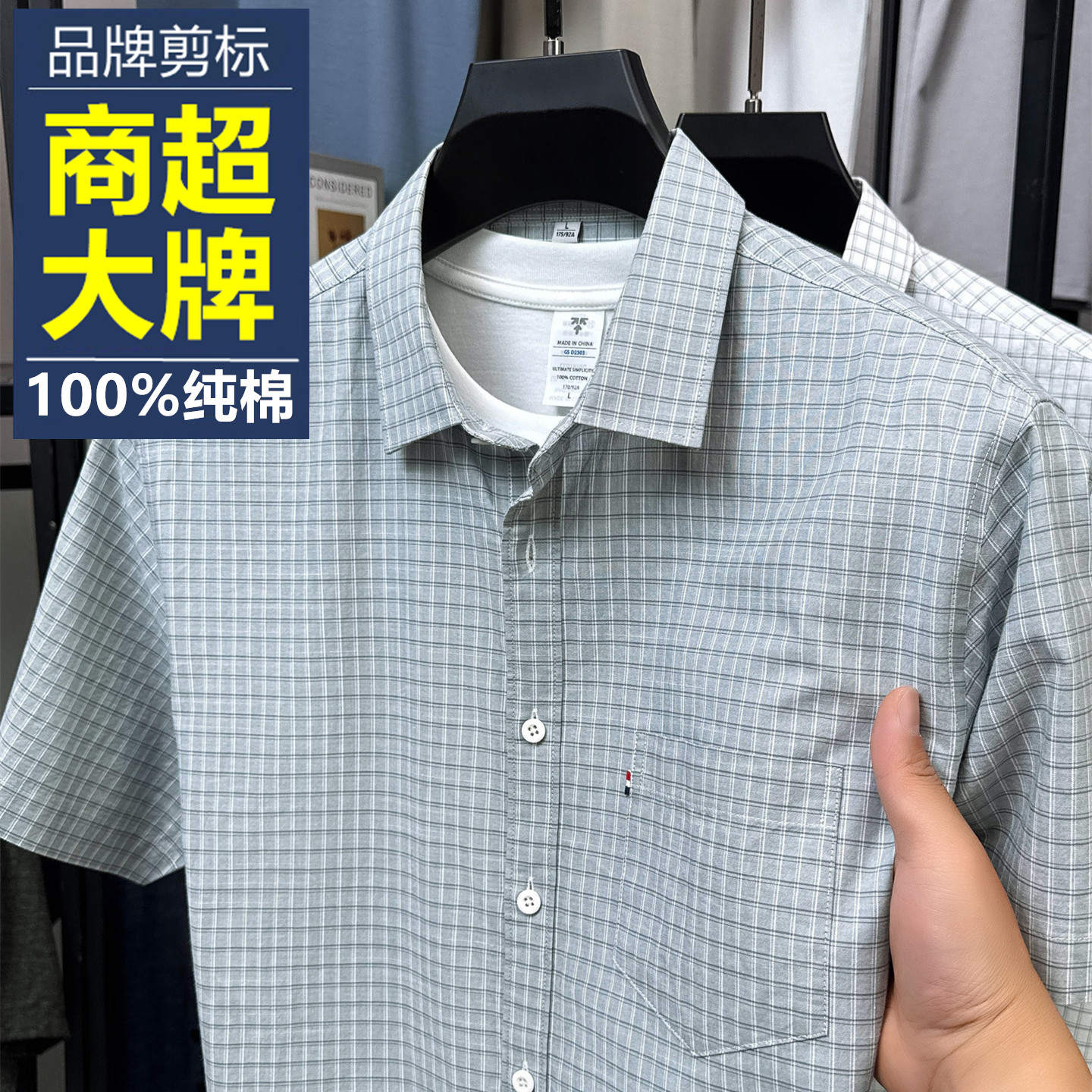 100%纯棉男士夏季短袖衬衫中年爸爸纯棉格子纹带口袋薄款休闲衬衣