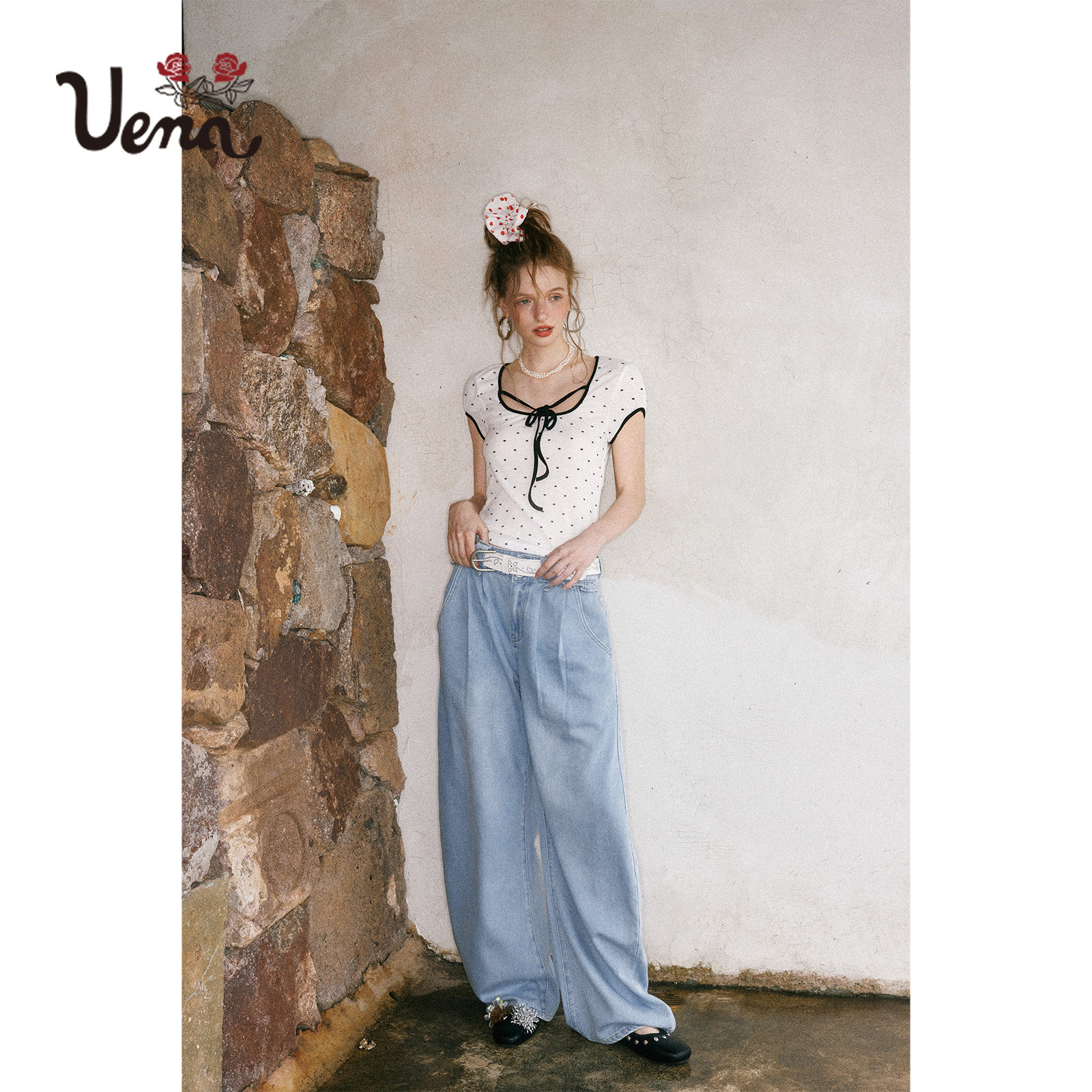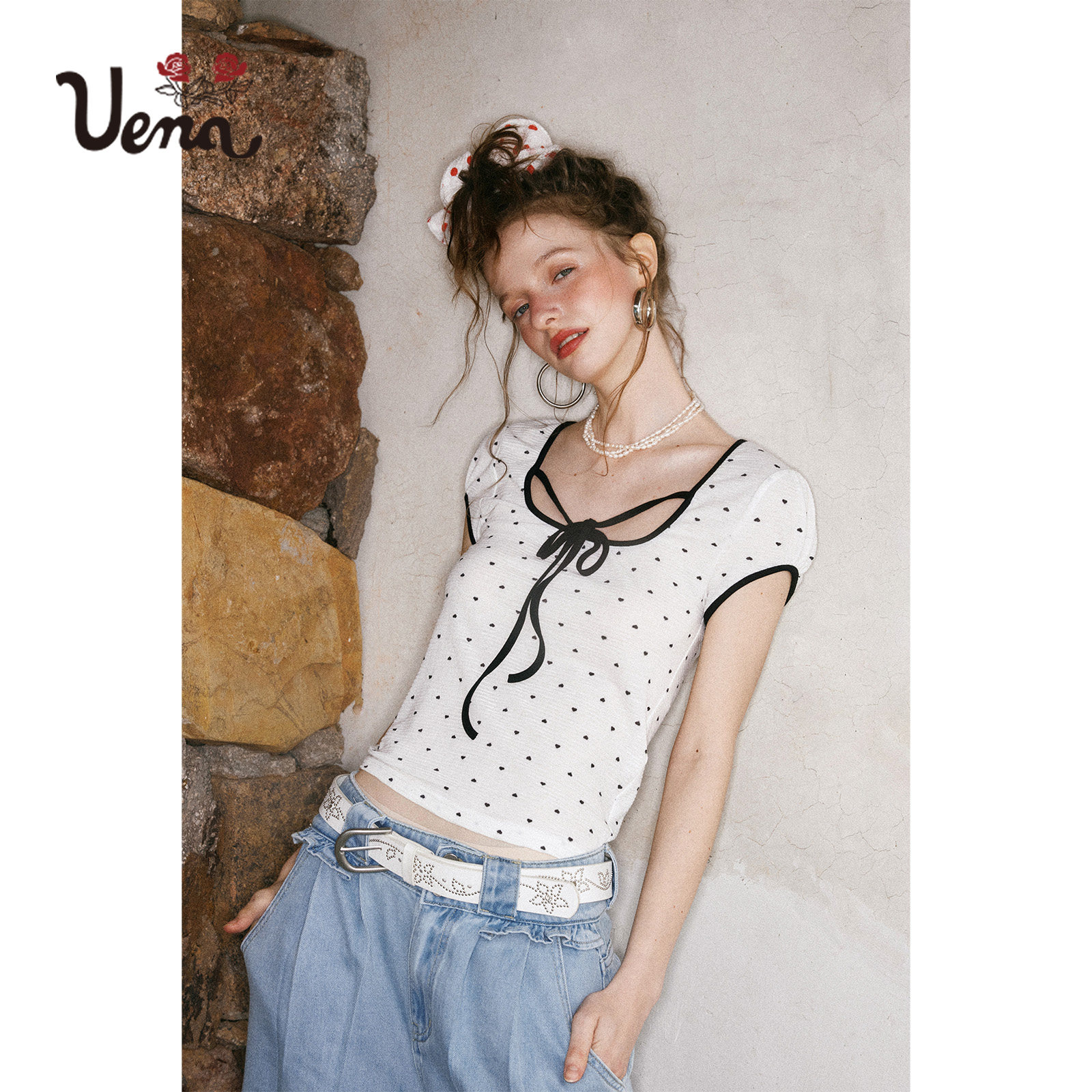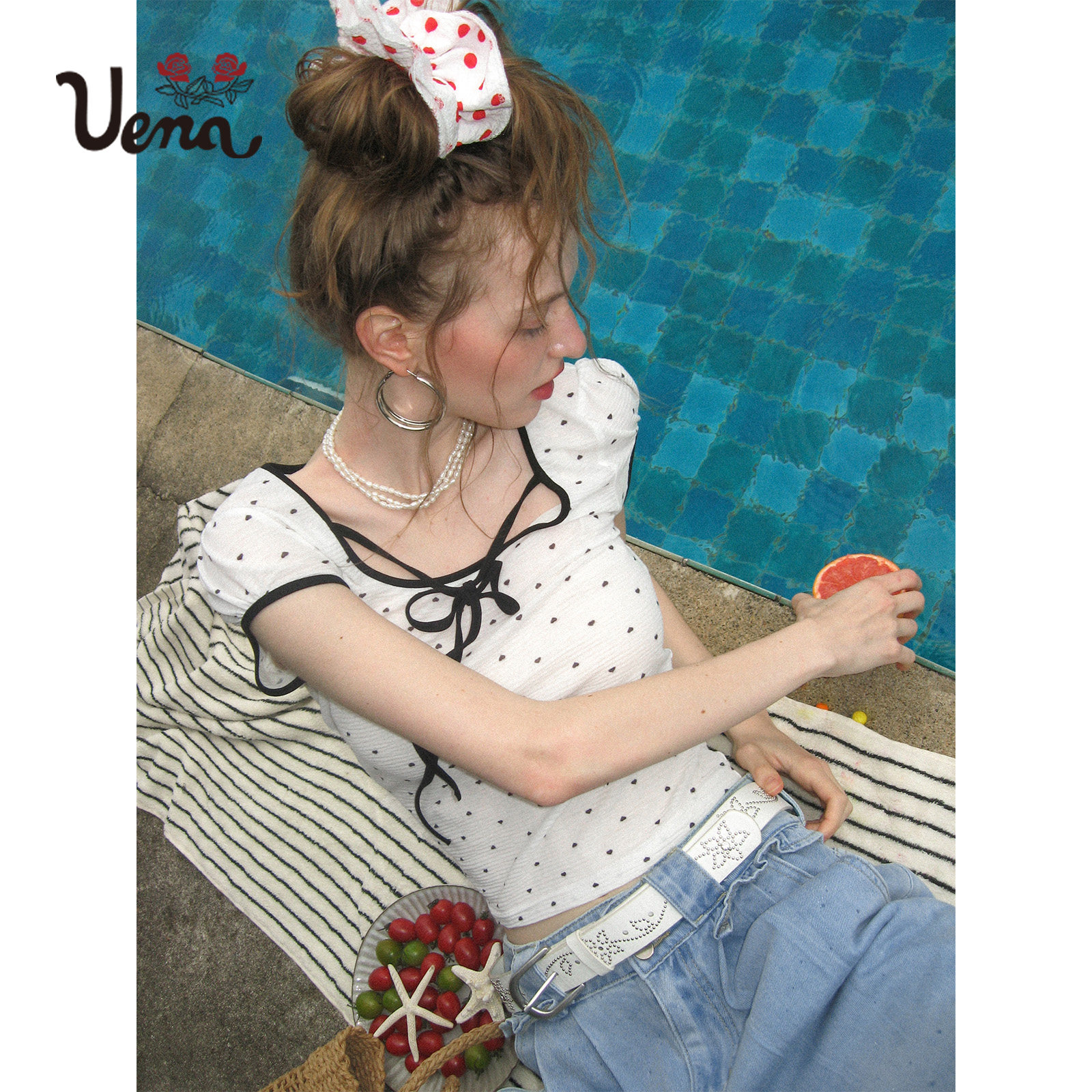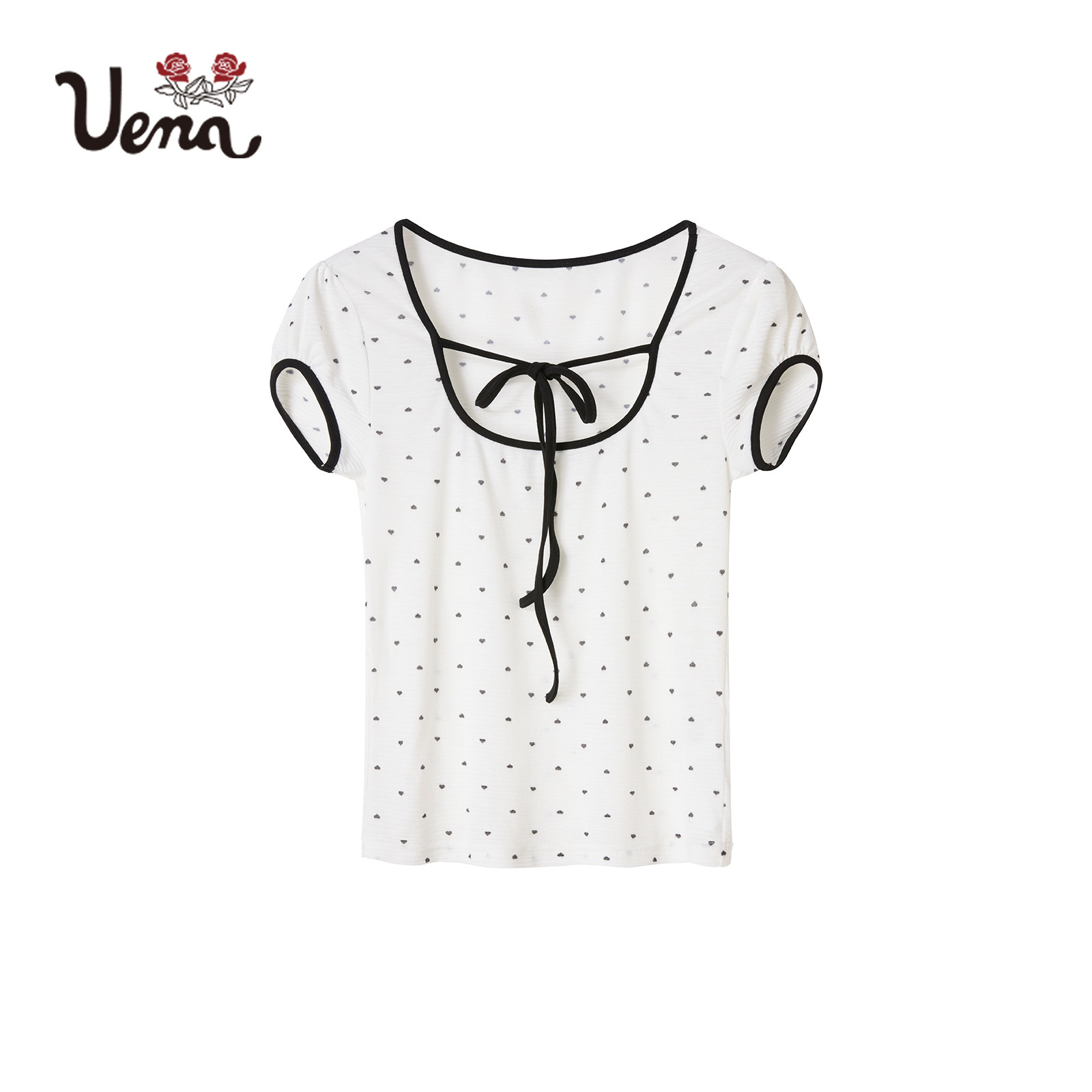 【黑桃情诗】Uena美式复古白色爱心印花胸前绑带修身短袖方领T恤