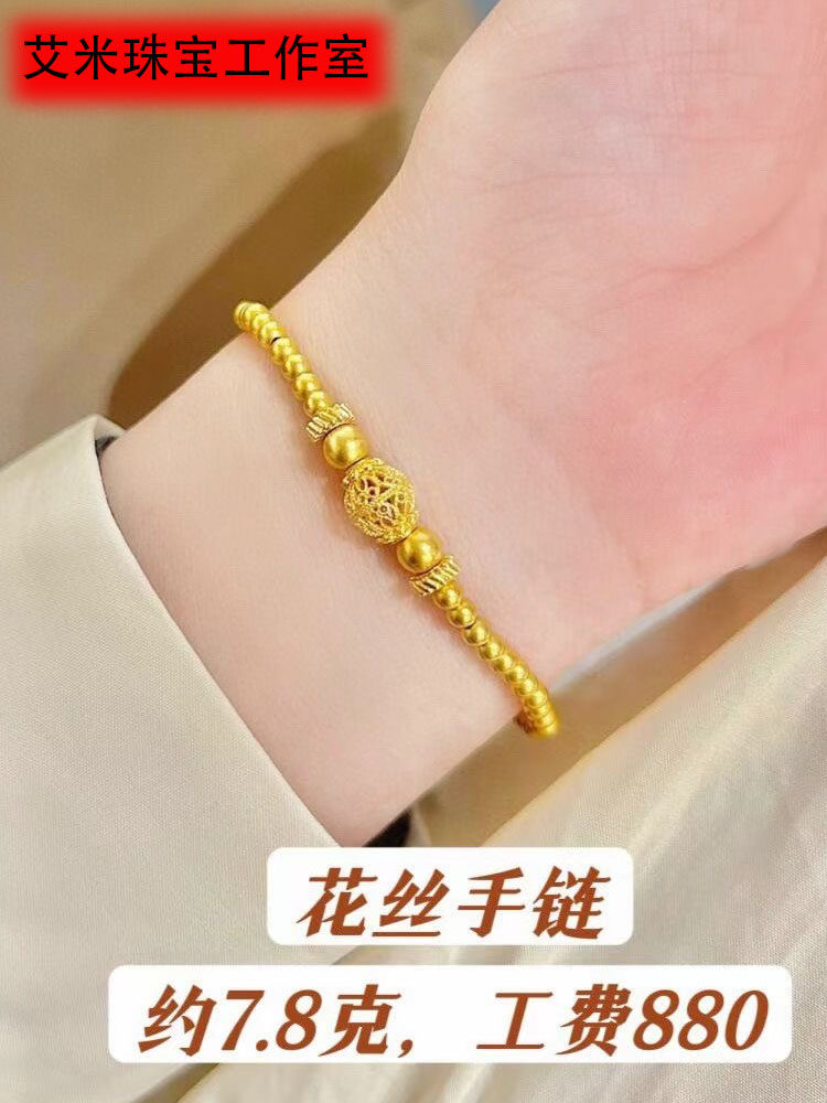 周大福传承999足金计价克减75古法金串珠转运珠黄金花丝手链女款