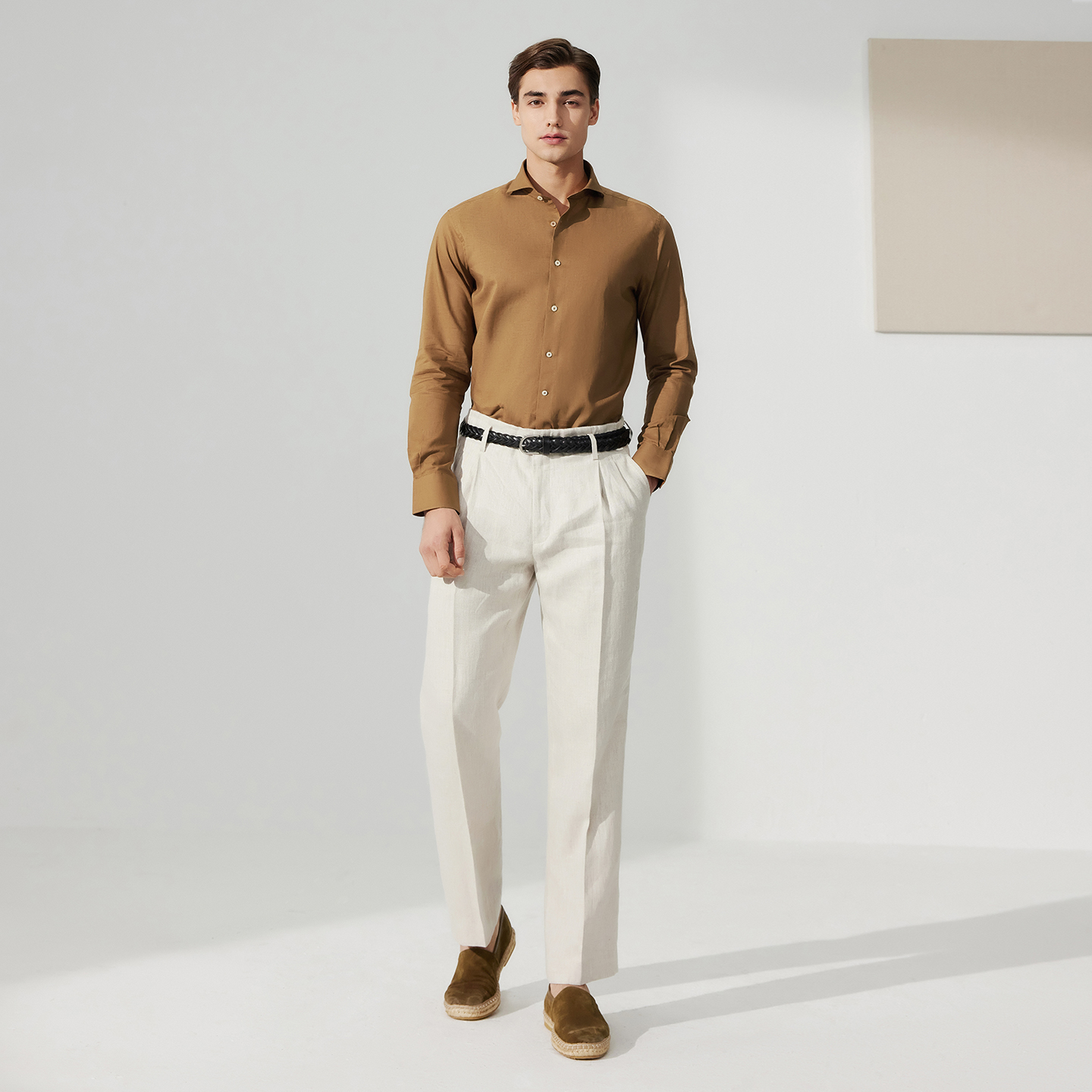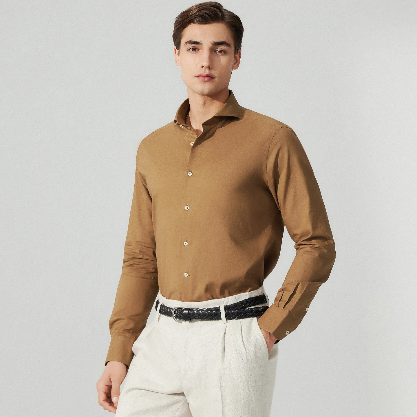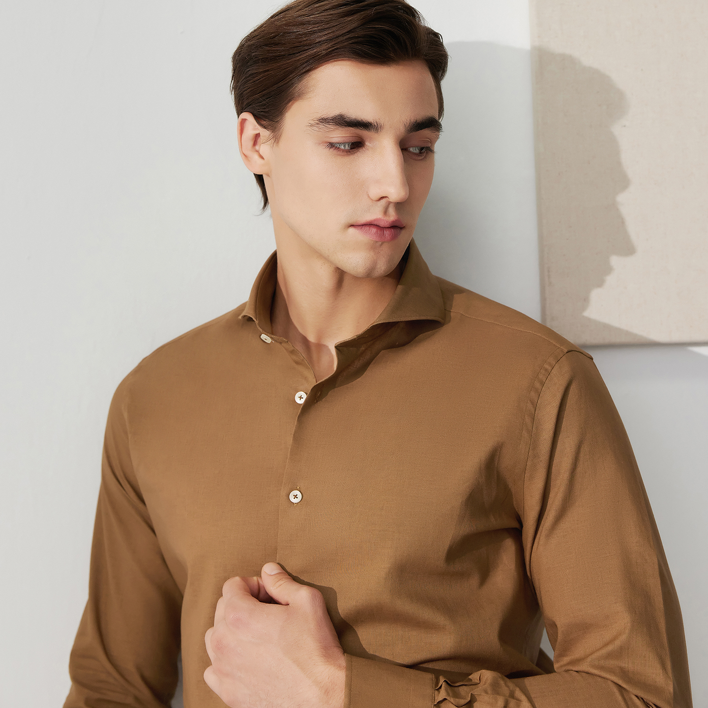 柏品棉亚麻棕色商务休闲长袖