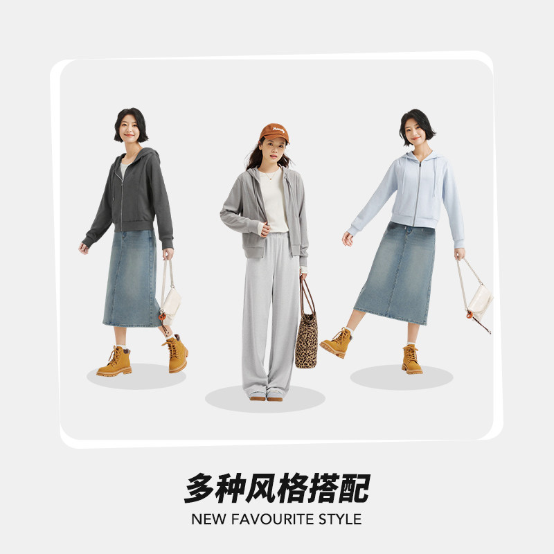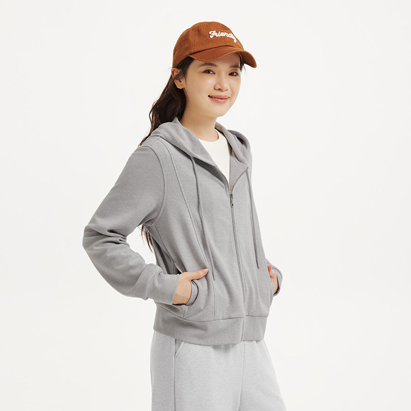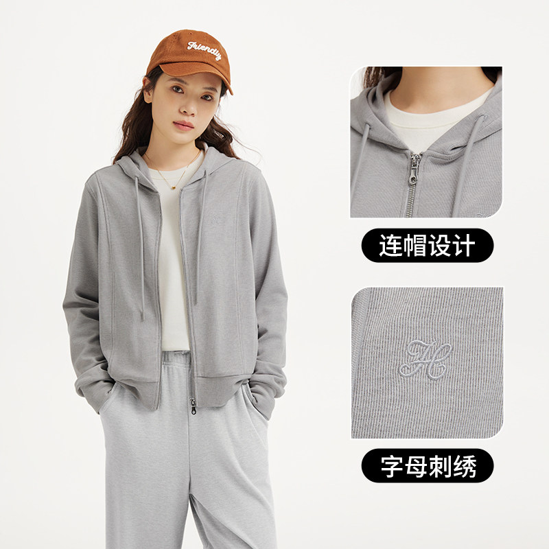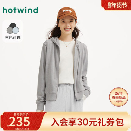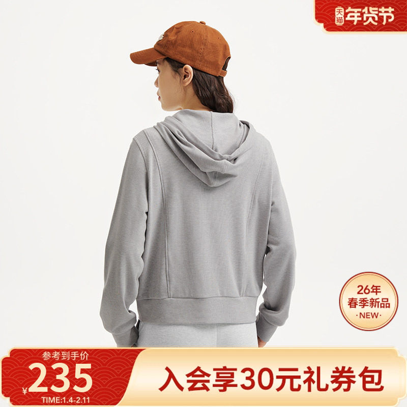 热风2026年春季新款女士舒适开衫连帽卫衣短款刺绣简约纯色