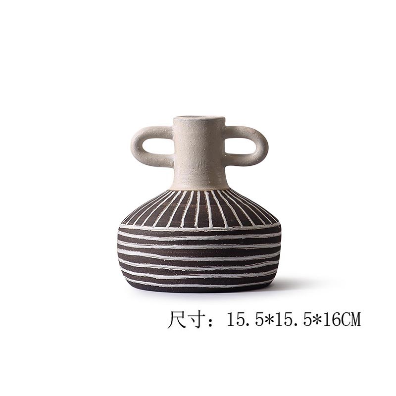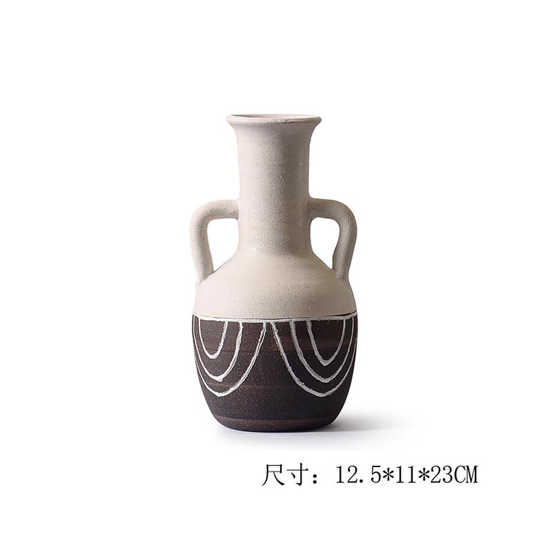 侘寂风粗陶艺术条纹花器简约双耳土黄色软装摆件民宿样板间花瓶