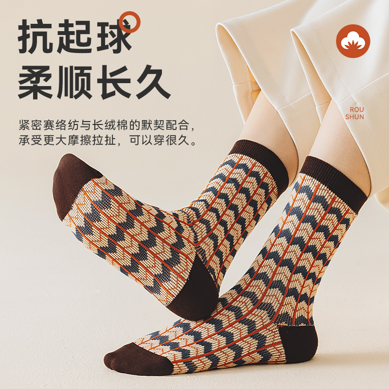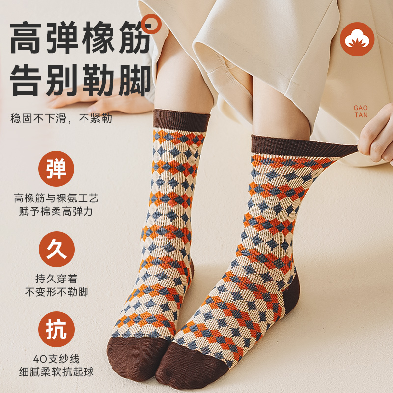 猫人袜子女中筒袜春秋季2025新款双针复古民族风棉袜潮流女士长袜