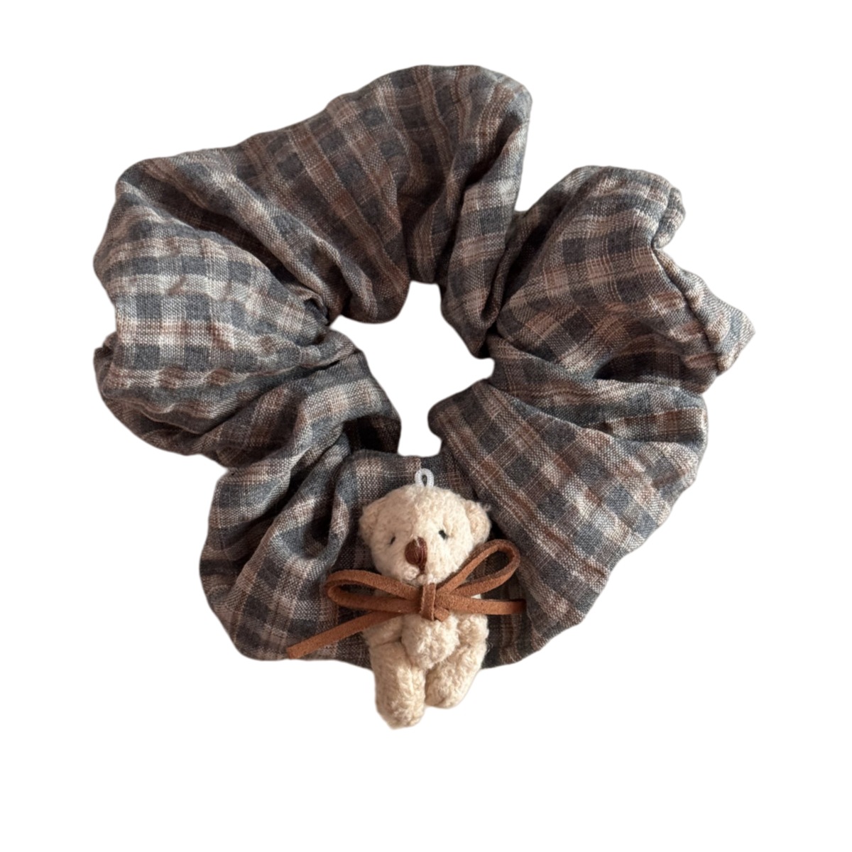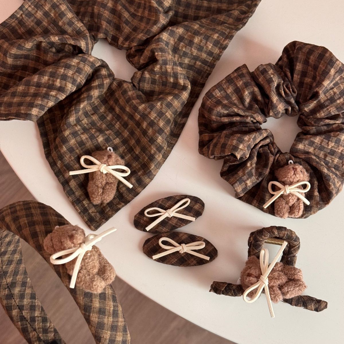 格纹蝴蝶结小熊玩偶复古方巾大肠圈可爱甜美高级感发圈发饰新款
