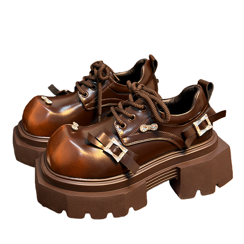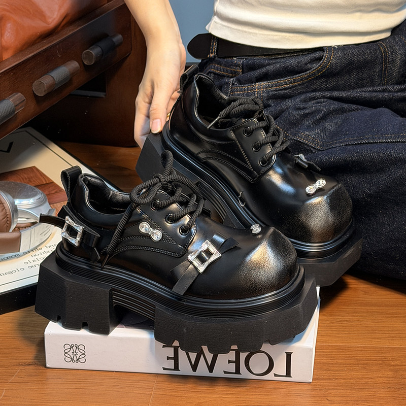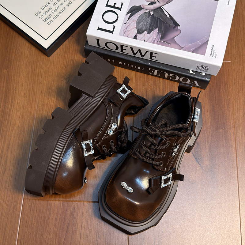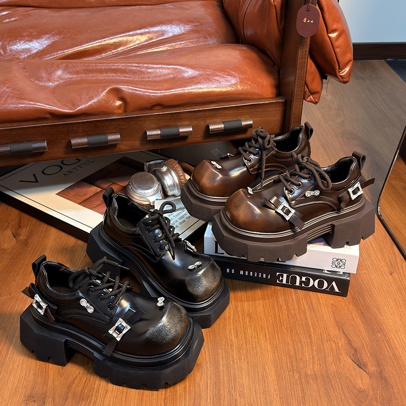 复古真皮松糕厚底小皮鞋女英伦风圆头德比鞋小个子增高加绒乐福鞋