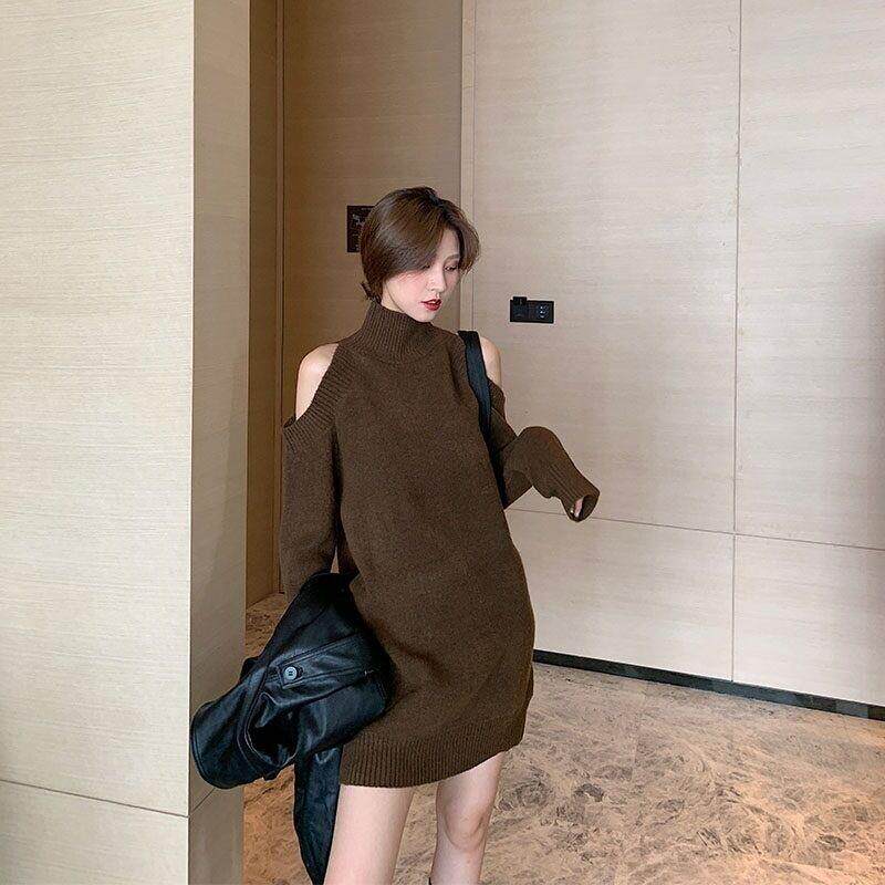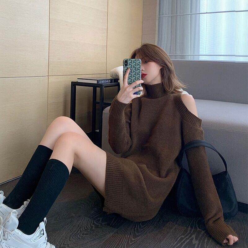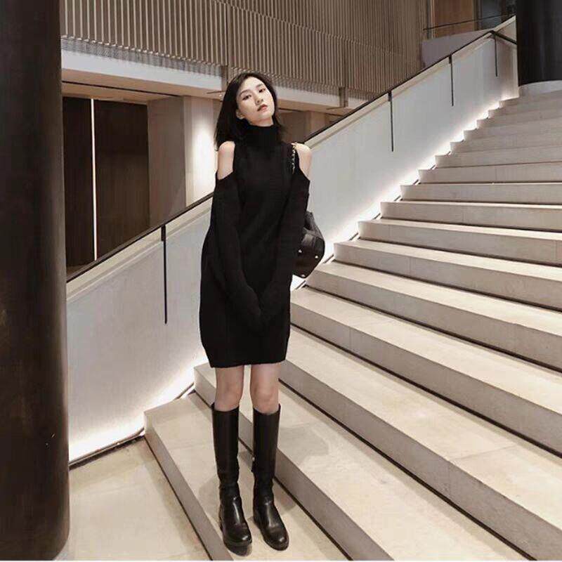 高级打底高领中长款毛显瘦搭露气质复古春季针织衣裙肩连衣裙内感