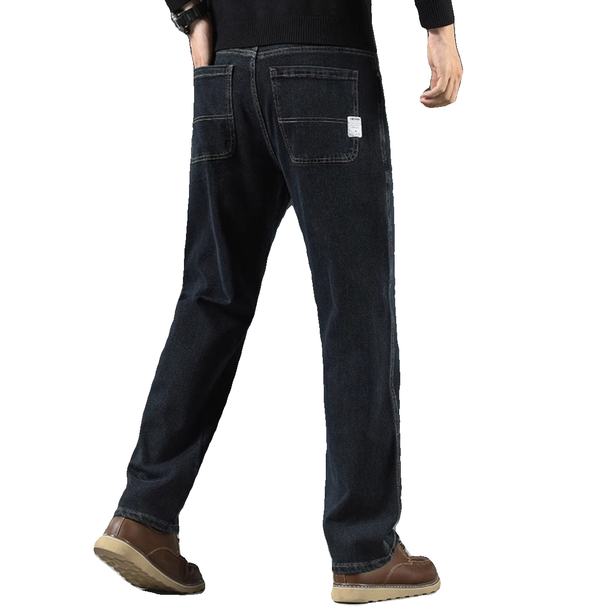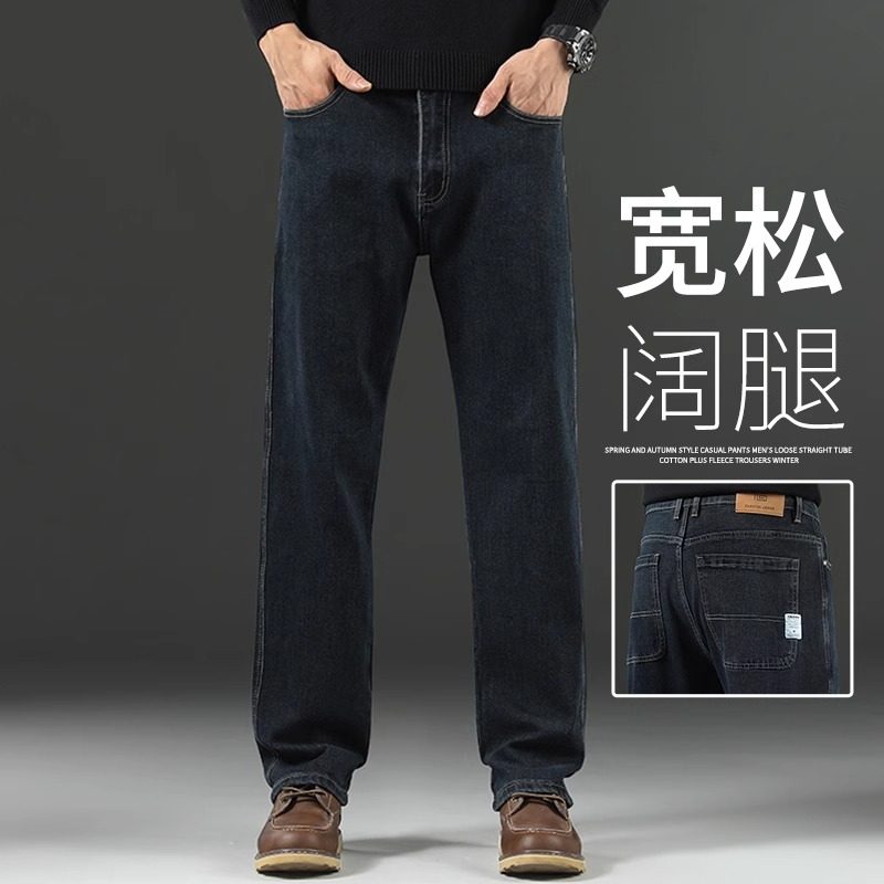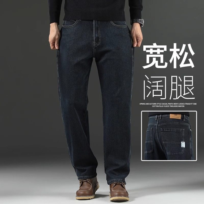 高端蓝黑色牛仔裤男夏季薄款阔腿宽松直筒大码中年冬天加绒裤子男