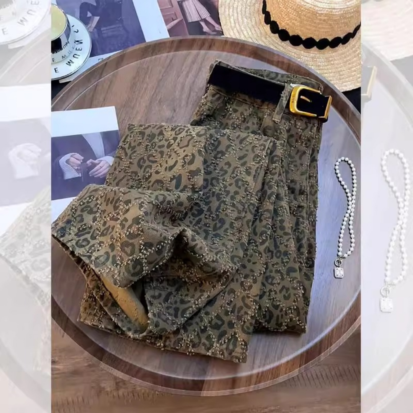 美式高街复古豹纹牛仔裤女2025年春夏直筒阔腿拖地裤显瘦长裤子潮