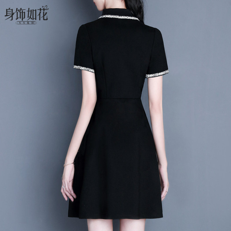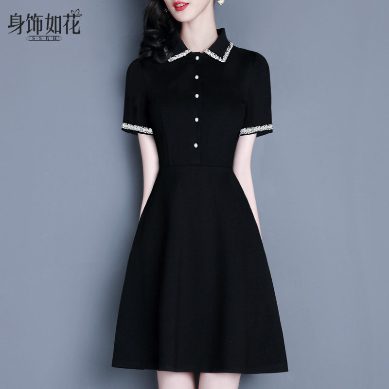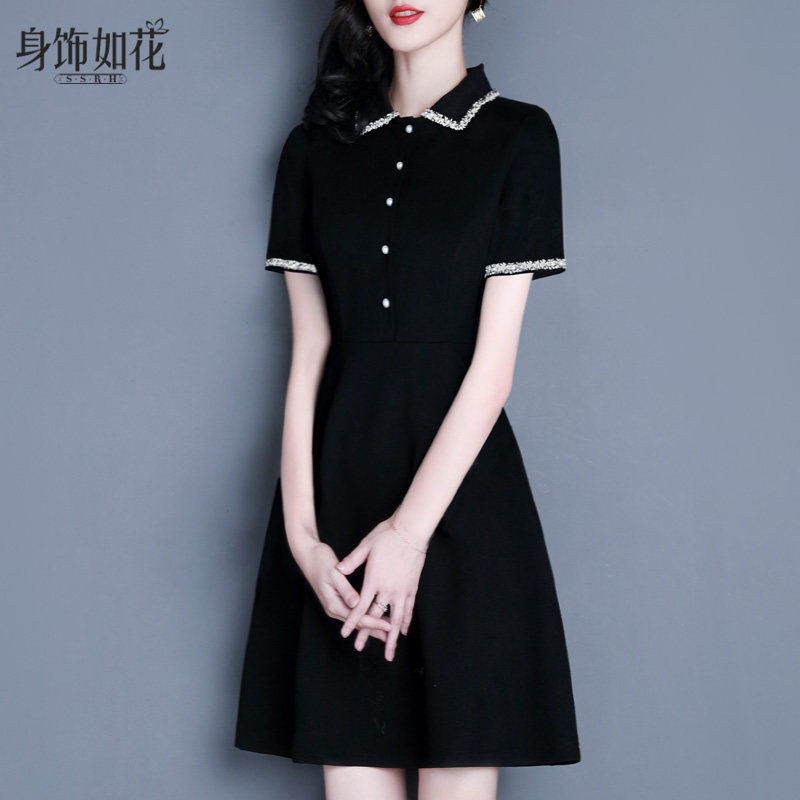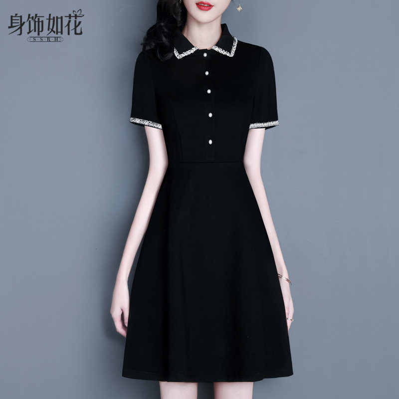 小黑裙2024春夏新款淑女气质A字裙娃娃领短袖修身显瘦黑色连衣裙