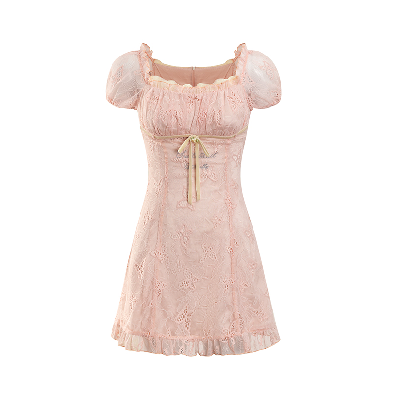 SunsetPark日落公园 新中式裙夏秋款蝴蝶蕾丝方领修身连衣裙短裙
