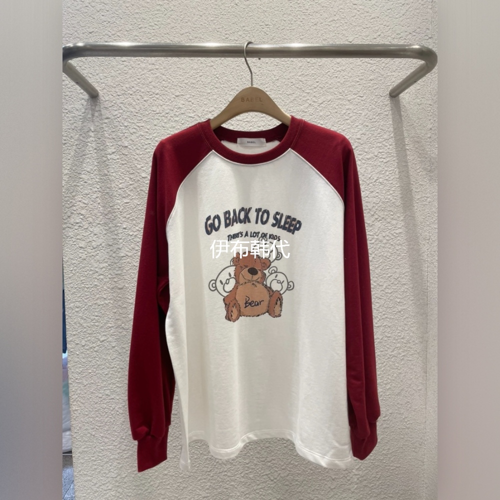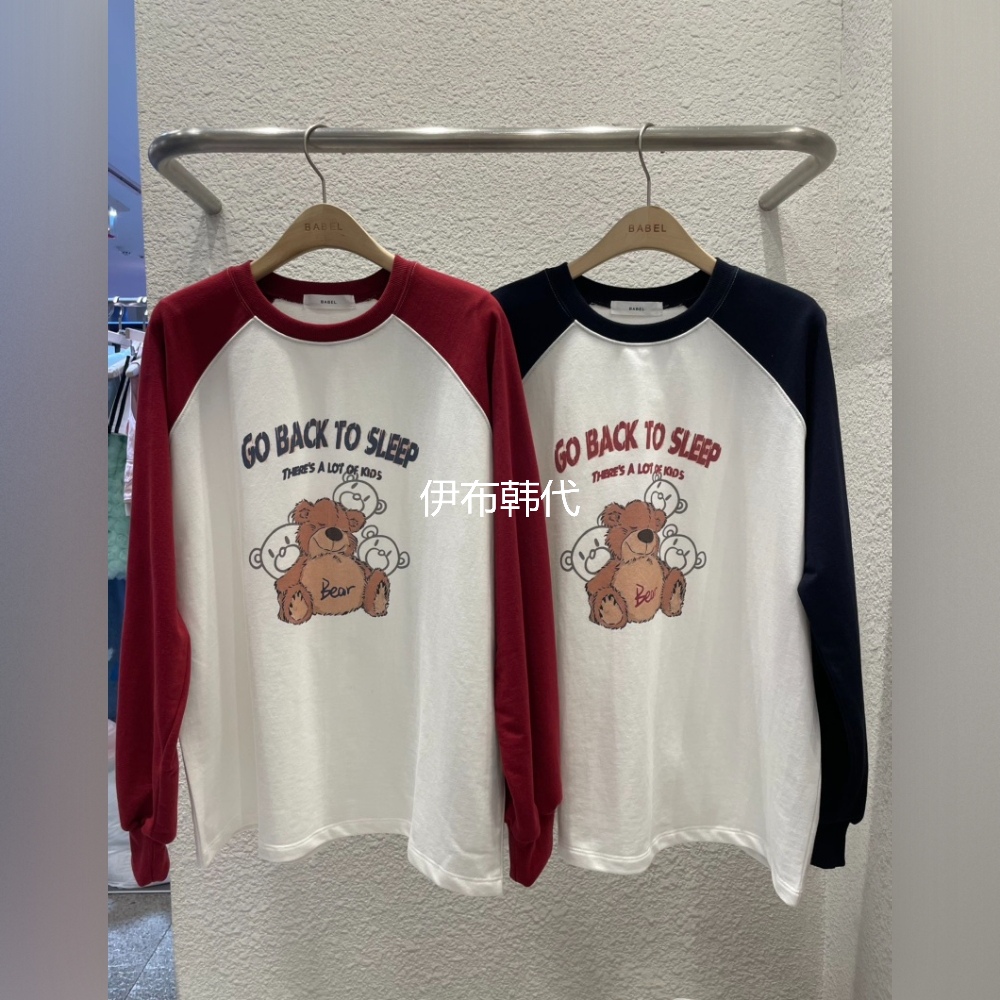 BABEL韩国东大门正品代购25早秋新款 圆领插肩字母小熊长袖T恤女