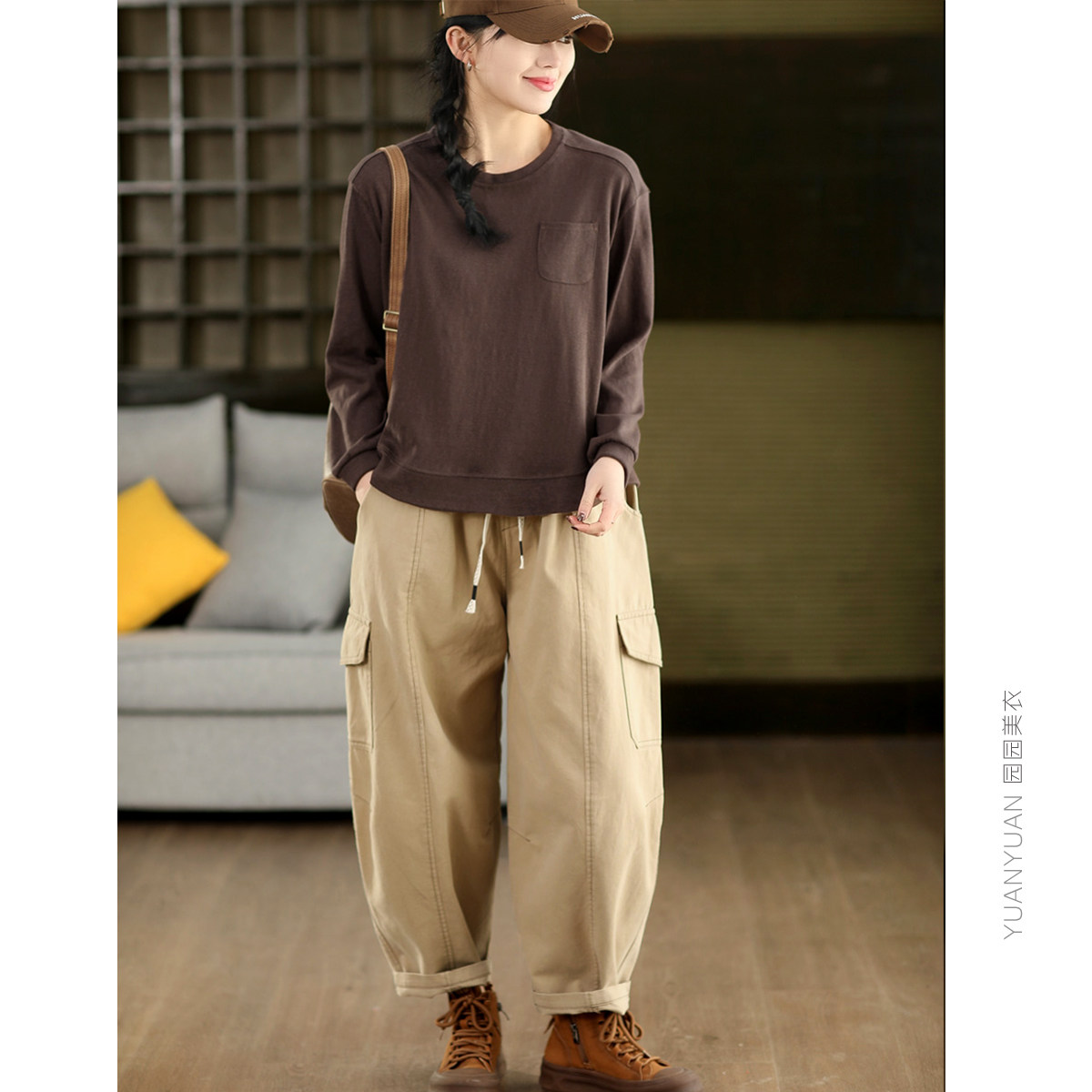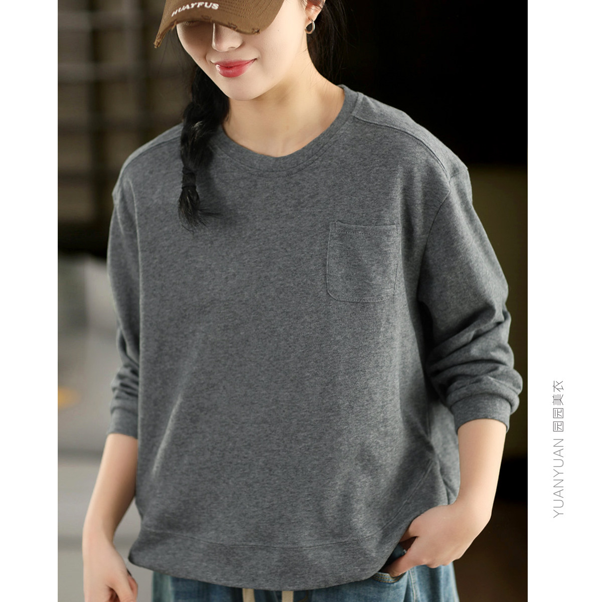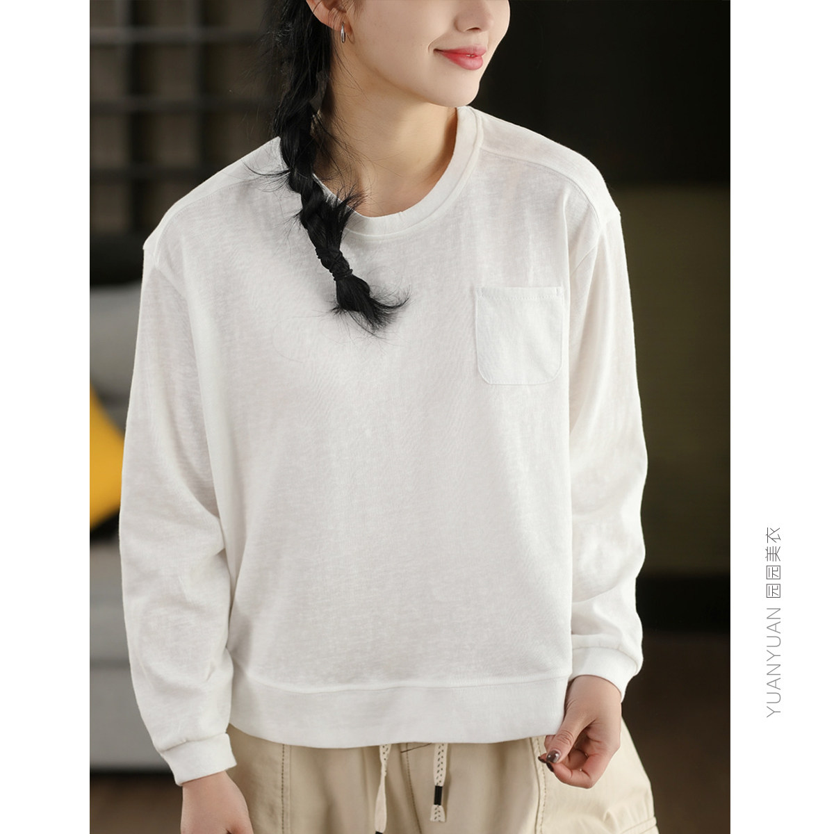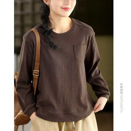 园园美衣新款复古亚麻长袖上衣春款纯色圆领套头衫T恤休闲卫衣