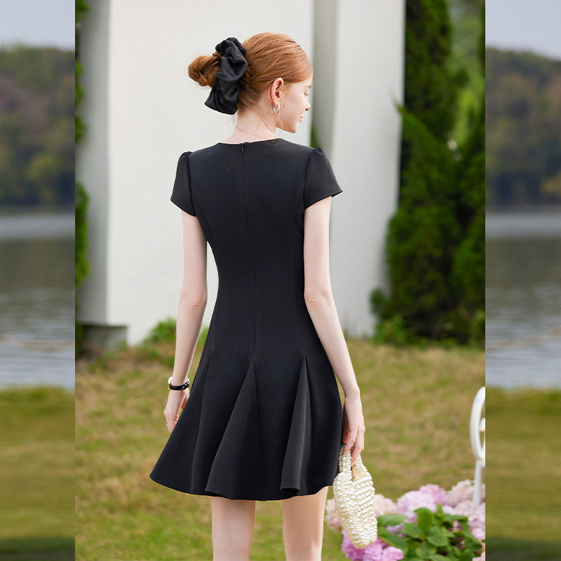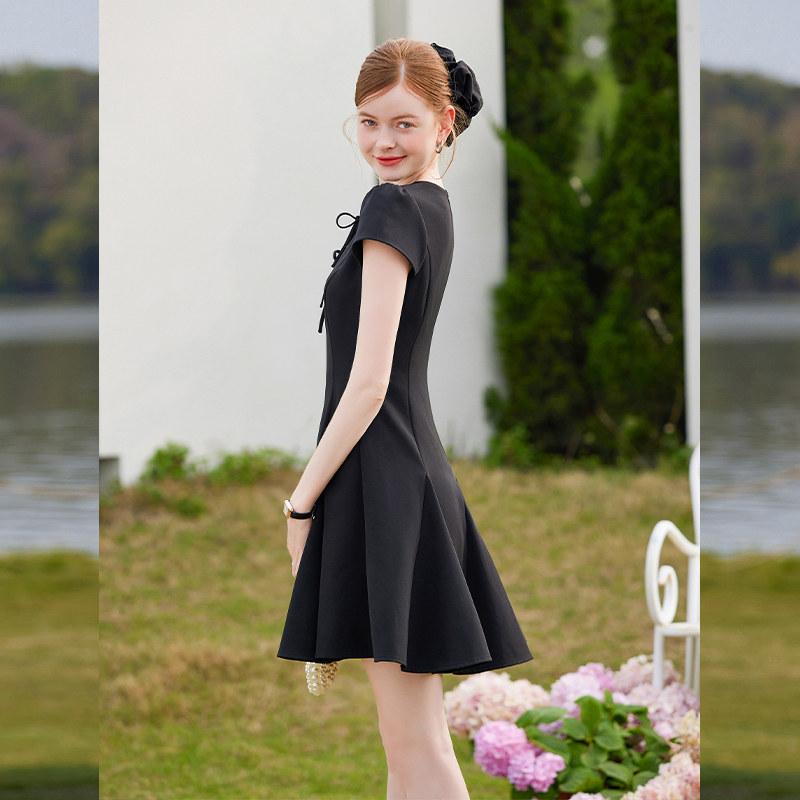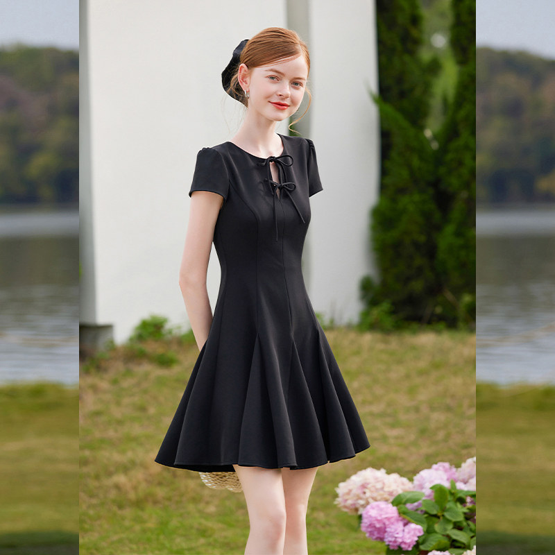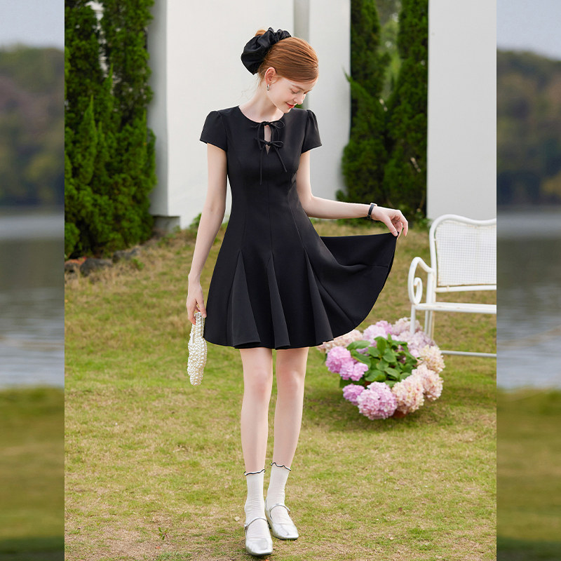 白鹿语蝴蝶结小黑裙生日裙25夏新款气质女人味收腰显瘦女连衣裙