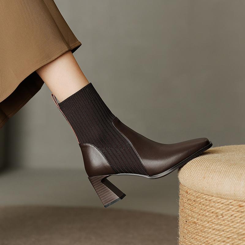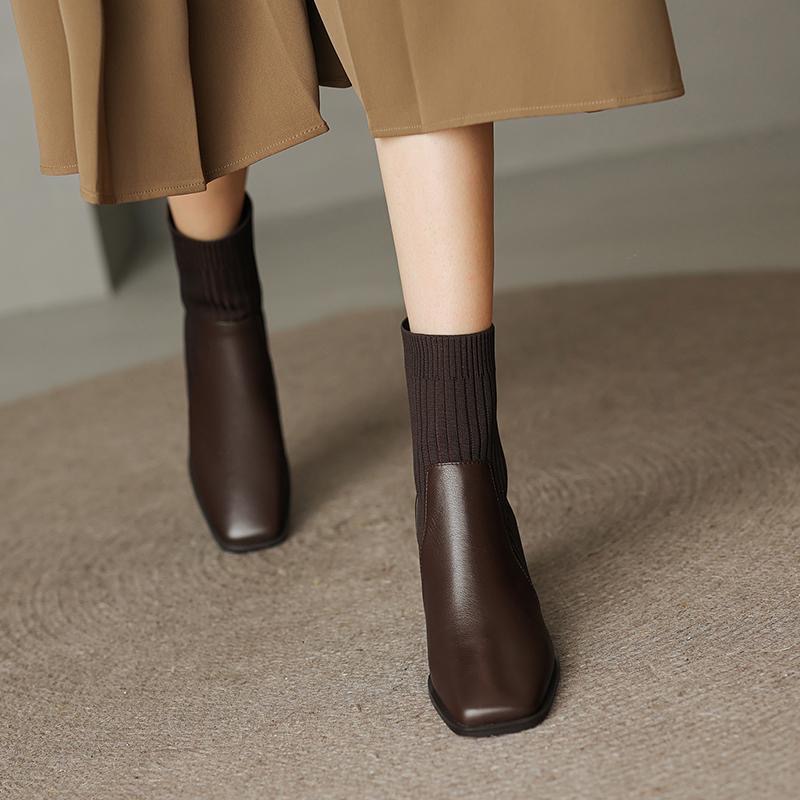 法式复古方头瘦瘦靴小个子高跟马丁靴针织短靴气质飞织粗跟袜子靴