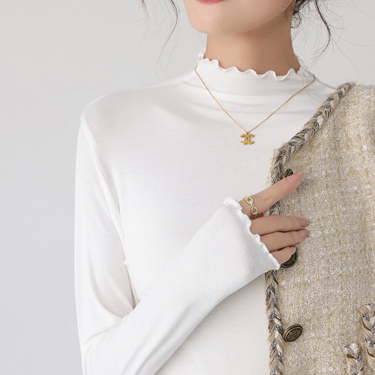 one more木耳边打底衫女2025秋季新款修身显瘦半高领长袖针织衫