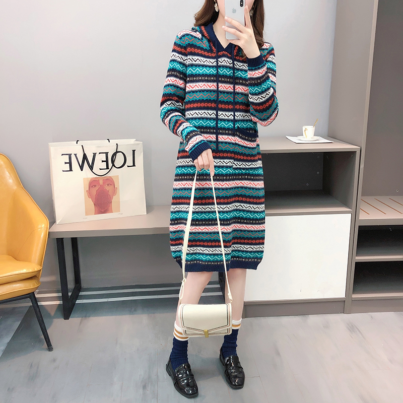 有帽子的连衣裙秋季复古毛衣裙港风针织裙子时尚宽松显瘦打底冬季