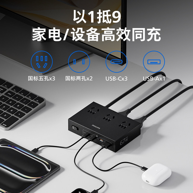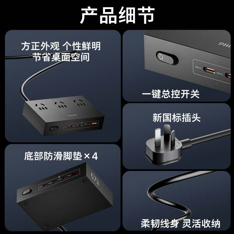 飞利浦魔方插座插排拖插线板带usb多功能插板桌面快充电站器排插