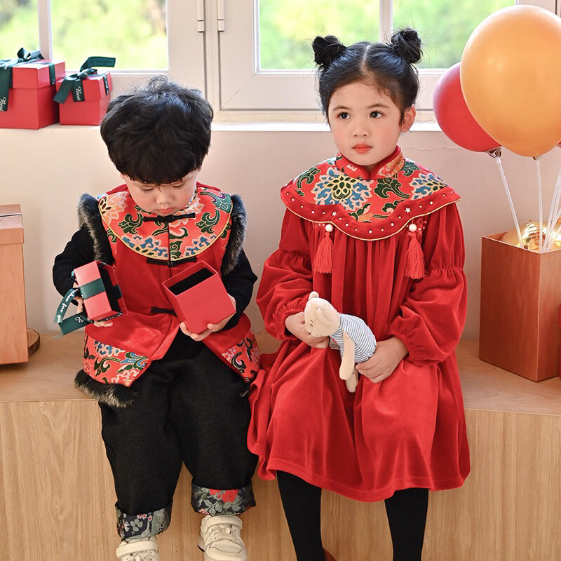 新款女童大红色中国盘扣立领格子纱拼接加绒旗袍连衣裙新年拜年装
