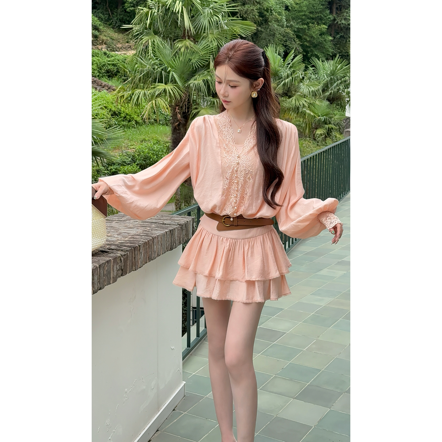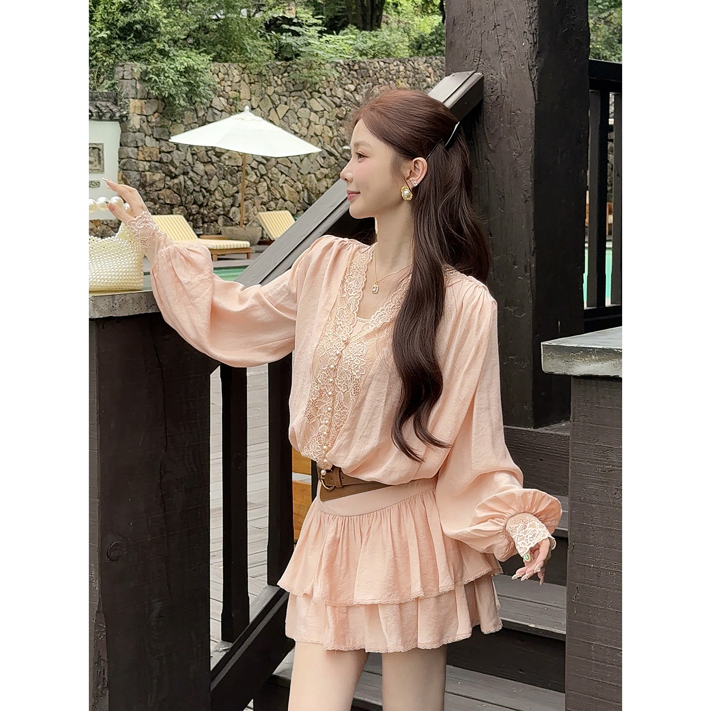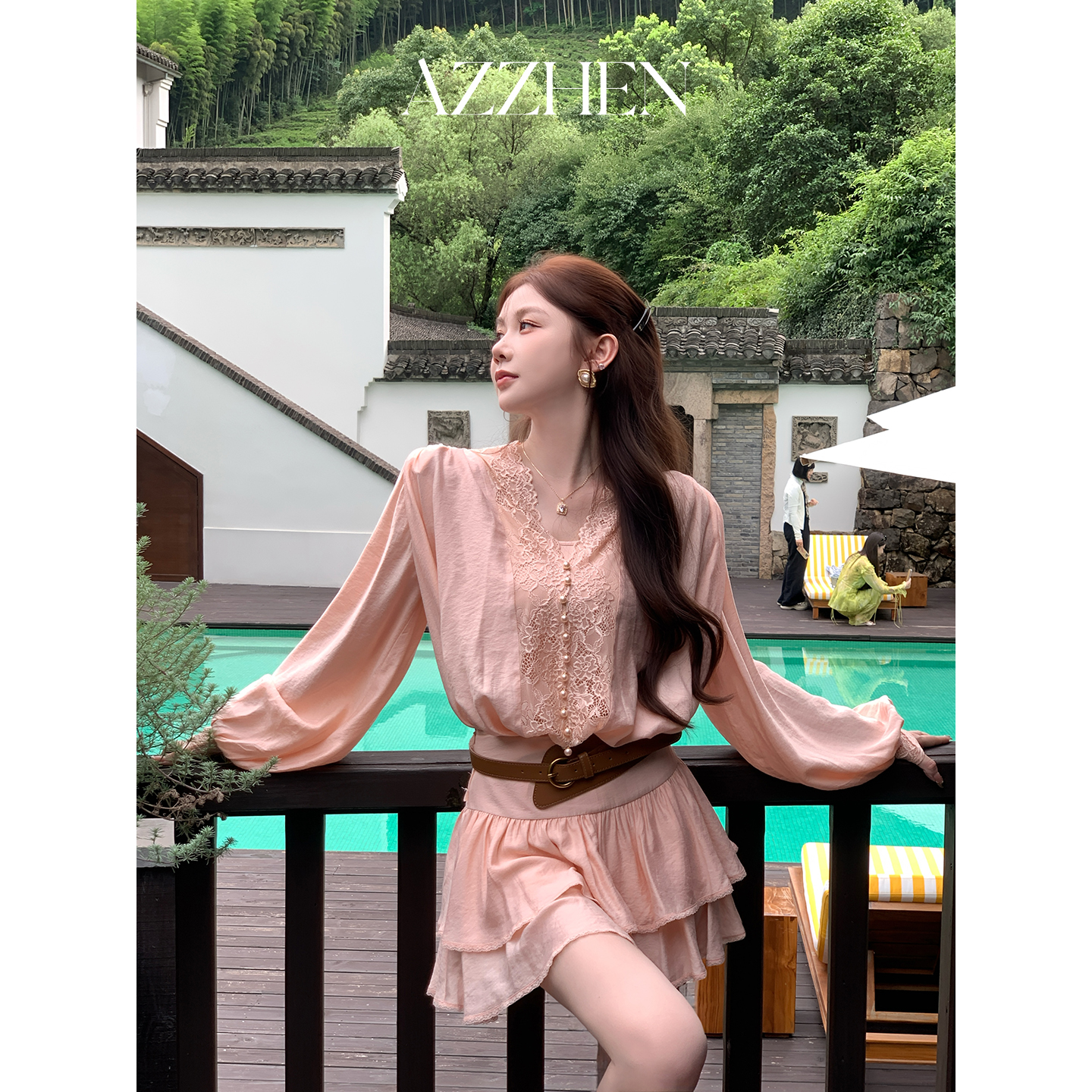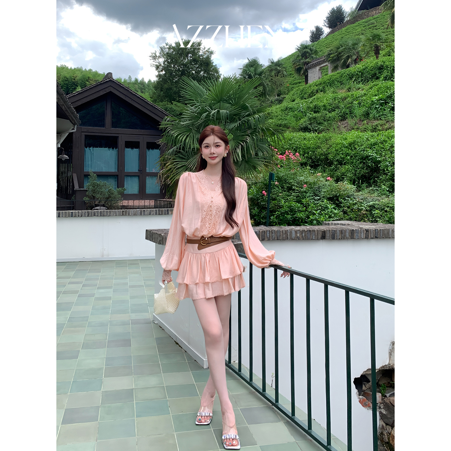 AZZHEN【雾都恋人】早秋重工长袖拼接镂空蕾丝衬衫吊带半裙套装女