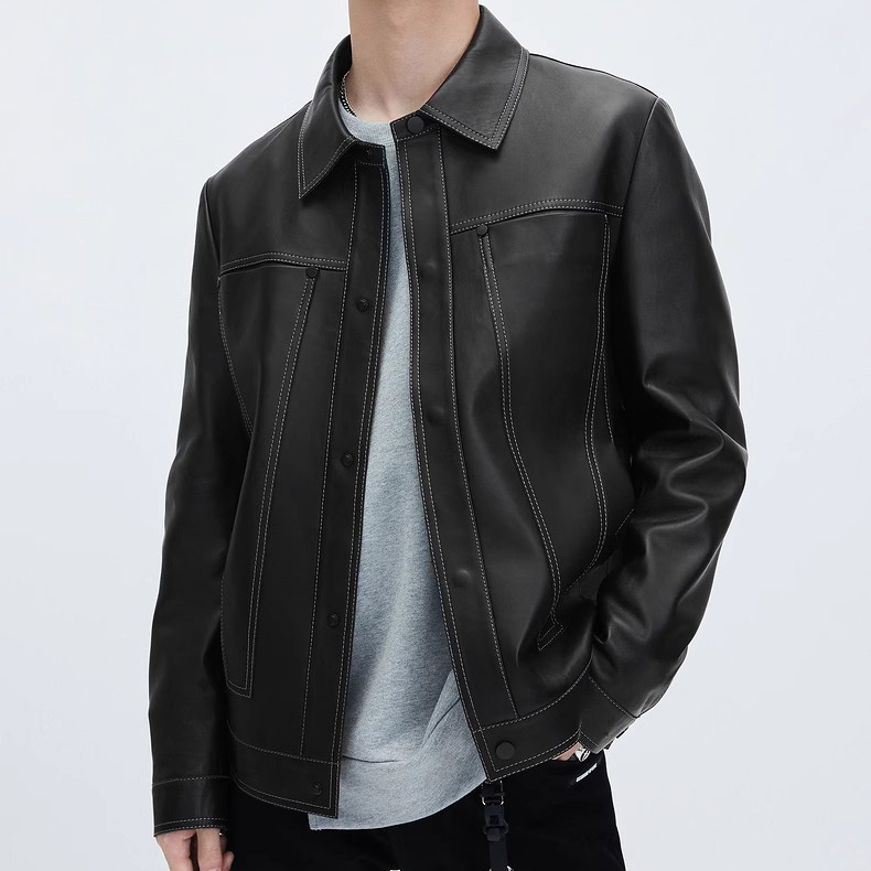 [商场同款]G家男装明线真皮皮衣春秋男士口袋翻领绵羊皮夹克外套