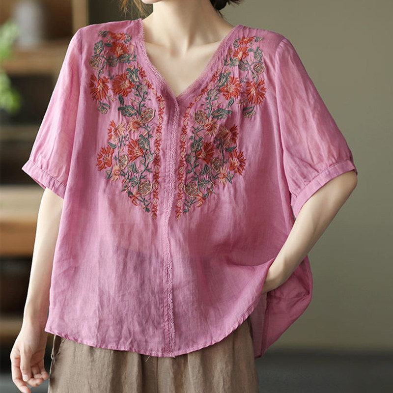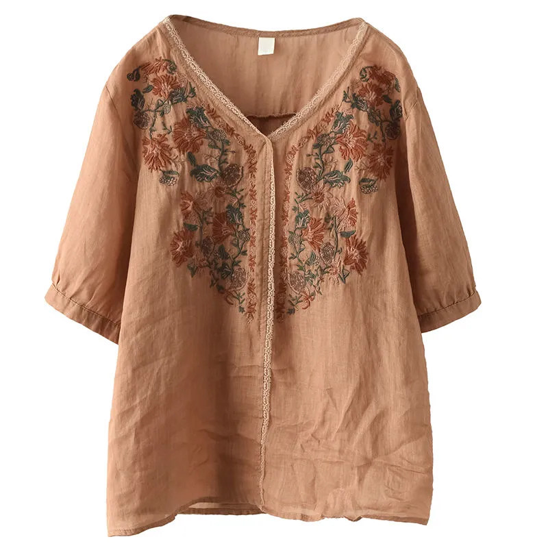 夏季复古文艺重工刺绣T恤棉麻上衣女士大码宽松气质套头短袖衬衣