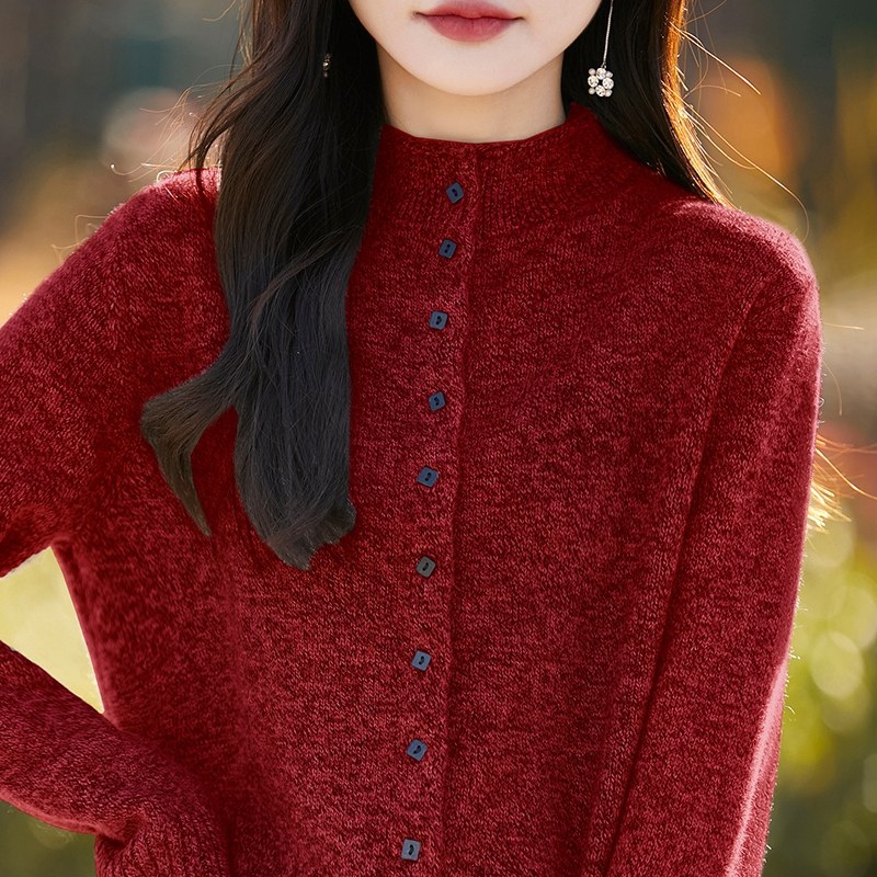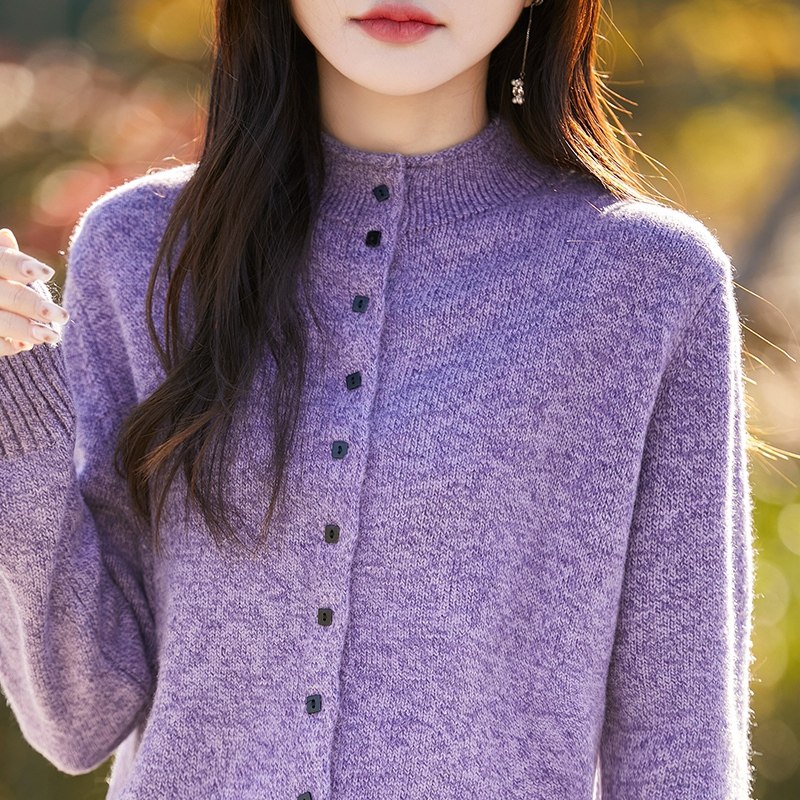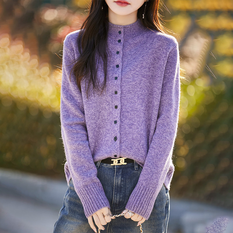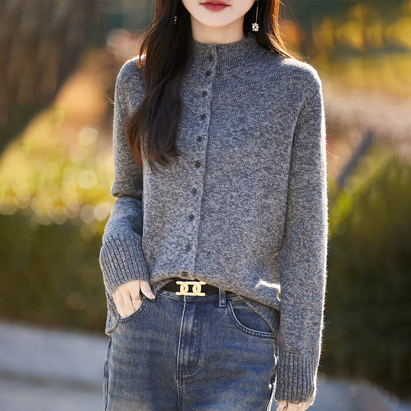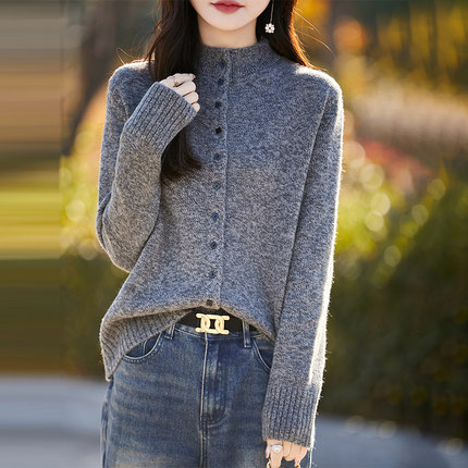 2025冬季复古高领针织开衫毛衣休闲百搭灰色软糯羊毛外套上衣女